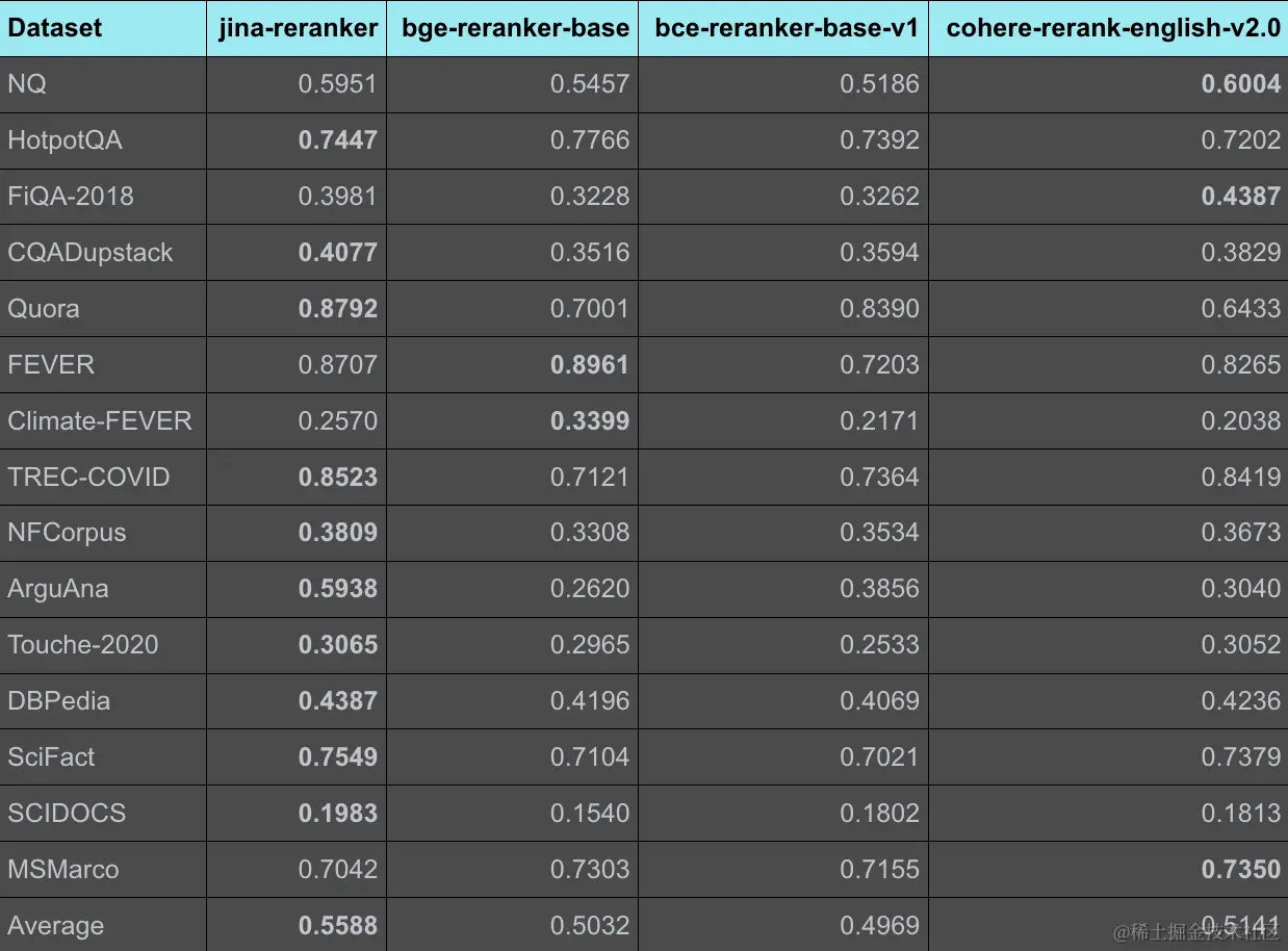我们采用了 LlamaIndex RAG、BEIR、MTEB 和 LoCo 等多个权威测试,并将 Jina Reranker 与其他三家领先的 Reranker ——BGE(BAAI)、BCE(网易有道)和 Cohere 进行了横向比较。全面评估了 Reranker 模型在查询理解、上下文匹配、排序精度等多个维度的表现。