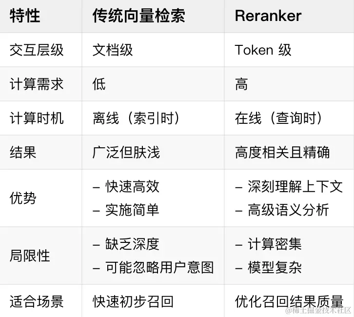 下表阐述了向量检索和 Reranker 模型之间的主要差异。