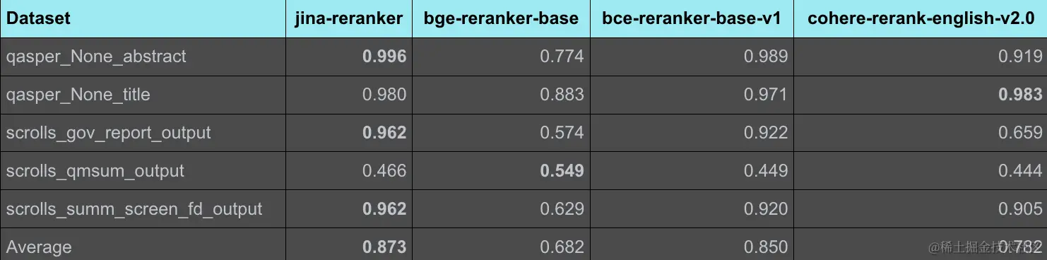 LoCo 衡量模型对局部一致性和上下文的理解,特别是超长文本(token 个数大于 1K)情形下的模型表现。Jina Reranker 在多个数据集上都取得了最高的 LoCo 分数,说明其识别相关信息并确定其优先级的能力很好。