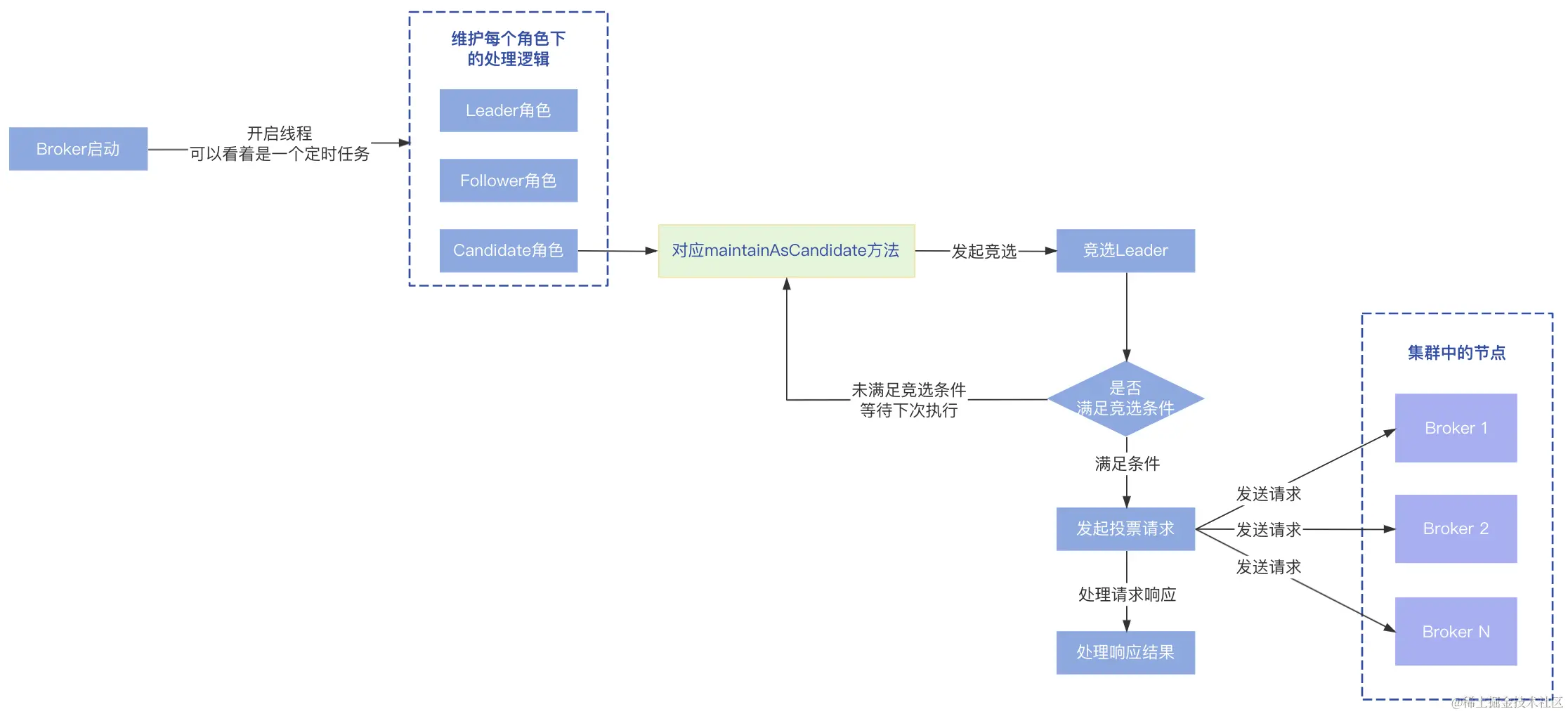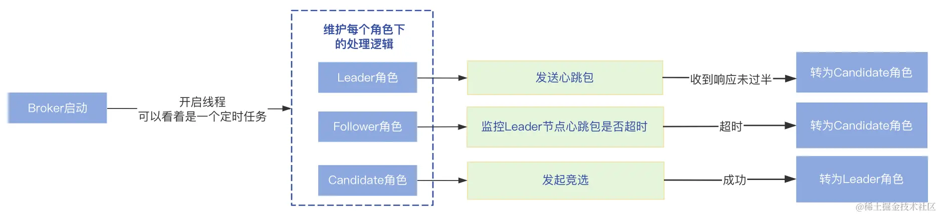 Broker启动后,会开启一个线程一直循环,所以可以看着是一个定时任务,不断的维护每个角色的处理逻辑,根据Raft协议可知节点有三种角色,所以对应三种处理逻辑: