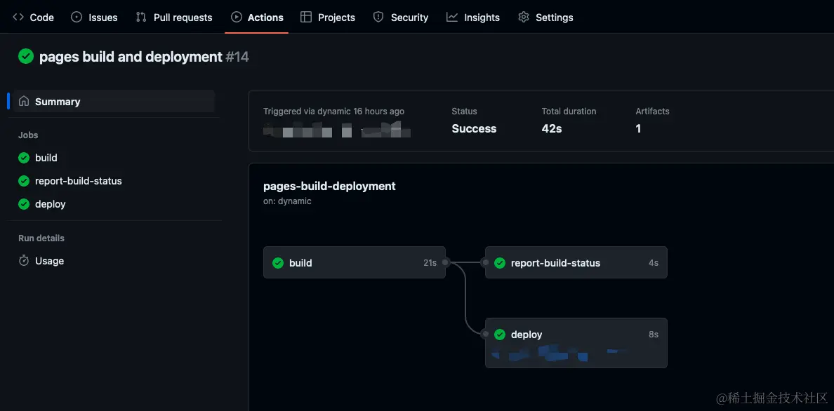 每次的推送成功后,我们可以从 Actions 选项卡下看到我们的部署任务是否完成: