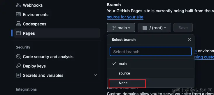 将分支设置为 none 即为关闭 Github Pages 服务: