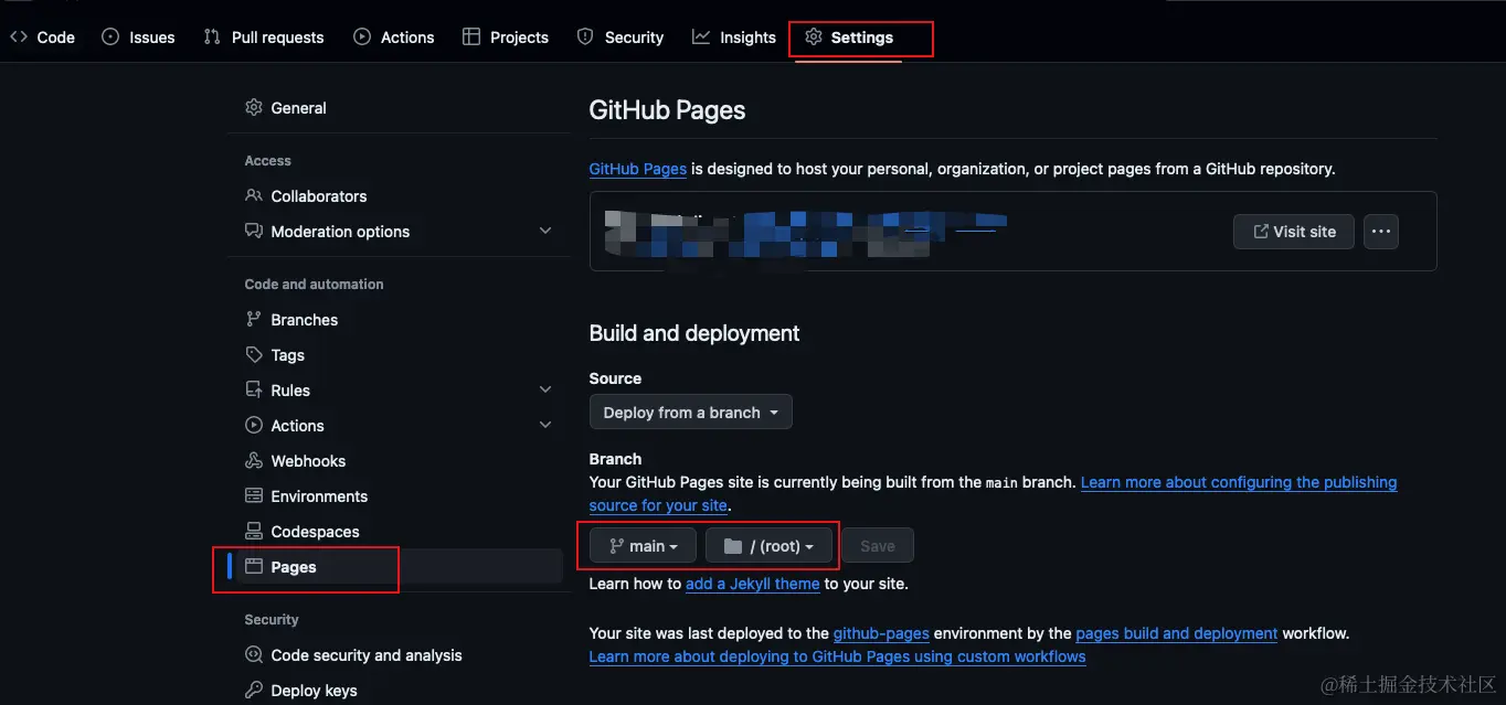 在仓库的 Setting 目录下可以看到 Github Pages 相关的配置,默认部署的是 main 分支根目录下的文件: