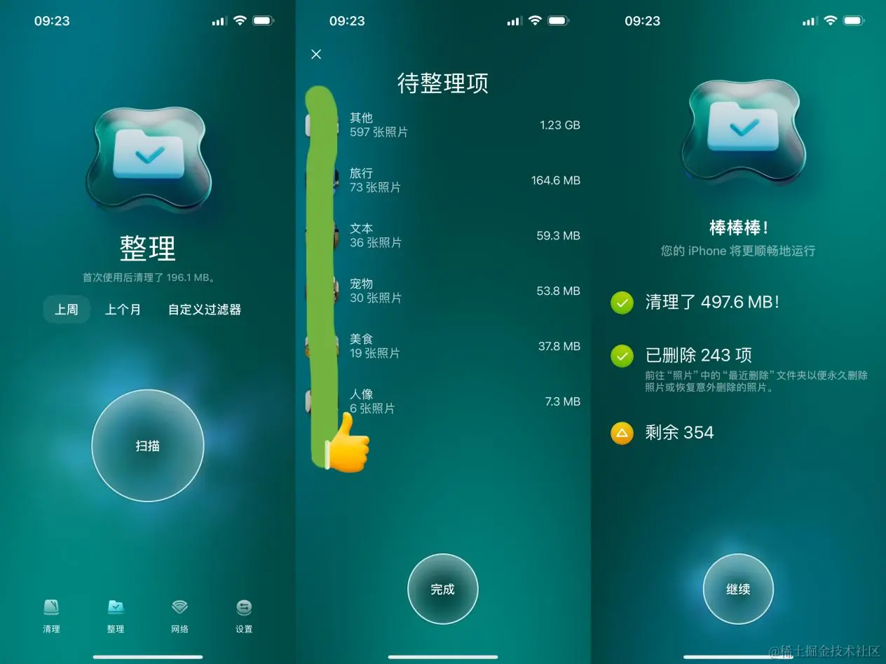 第二个功能是整理。和清理不同,整理的目的是给你的相册分类。人工智能说了,你们人类挺不讲究,家里收拾得干干净净,吃的归吃的,用的归用的,怎么手机相册里就大乱炖,啥都混一起了呢?CleanMy®Phone可不惯着你,直接就一张张给你翻过去,这张是人像,那张是猫,这张是披萨,都给你分门别类整理好,你直接点完成就完事了。这舒心的程度,不下于英国管家给我把车厘子喂到嘴里啊。