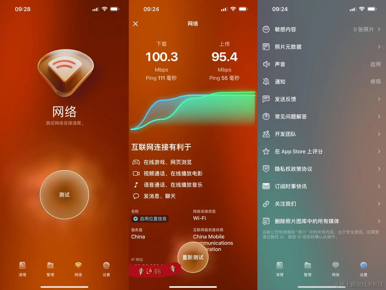 最后一个功能是网络测速,这个跟相册整理没啥关系,不过正正巧巧击中了木头姐的内心深处:作为一个重度网络依赖症患者,我真是太需要这项功能了!来,点测试,看看我家宽带网速怎么样。呦呵,不咋滴啊,说好的千兆宽带呢,怎么就给我整个100兆?中国YD你是欺负我从小数学不好是吗?要不是有CleanMy®Phone,我还真知不道这小子在我背后给我整活儿呢。回头得找他去。