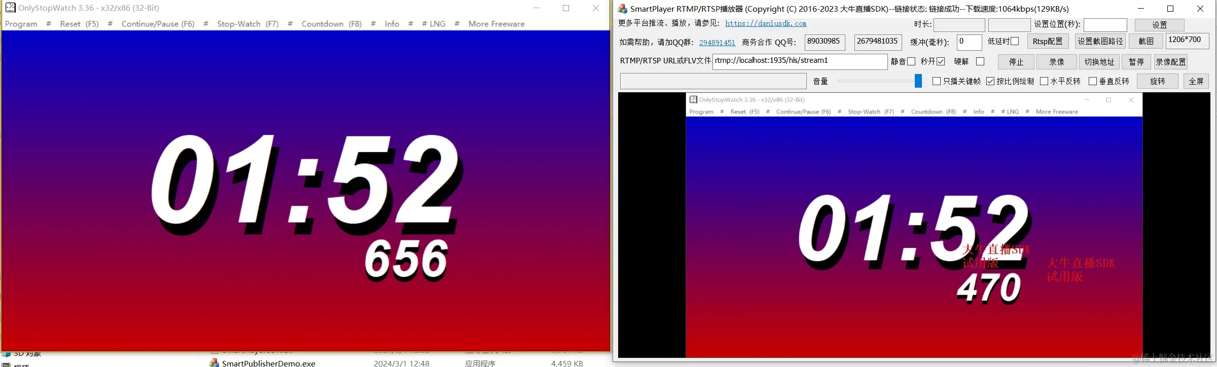 启动Windows平台窗体采集,设置H.265硬编码,输入RTMP推流URL,实现Enhanced RTMP推送,播放端拉流播放,整体延迟如下: