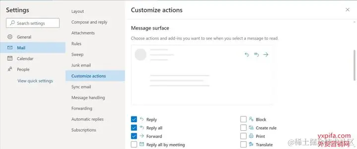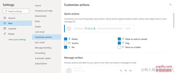 打开[Setting 设定],点击最底部的[View all Outlook Setting 检视所有Outlook设定],在左侧[Mail 邮件]的设定中找到[Customize Actions 自订动作],在这里你就可以设定在收件箱页面常出现的小工具如删除键、封存键、置顶键等等。