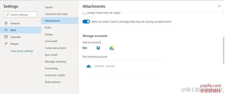 Outlook当然是连接同属微软的OneDrive云端硬盘啦~但是Outlook也允许用户连接其他的云端硬盘服务如BOX,Dropbox以及Google Drive。
