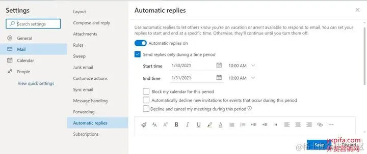 这个依然从设定开始,在Hotmail邮箱中找到[Automatic Replies 自动回复],设定自动回复的开始日期和结束日期,输入自动回复的内容,比如向寄件者表明你正在休假等信息。