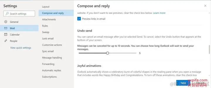 打开[Setting 设定],点击最底部的[View all Outlook Setting 检视所有Outlook设定],在左侧[Mail 邮件]的设定中找到[Compose and reply 撰写以及回复],往下滑找到[Undo Send 取消发送]。来到这里就可以选择按下发送键后选择Undo Send的秒数,最多只有10秒。