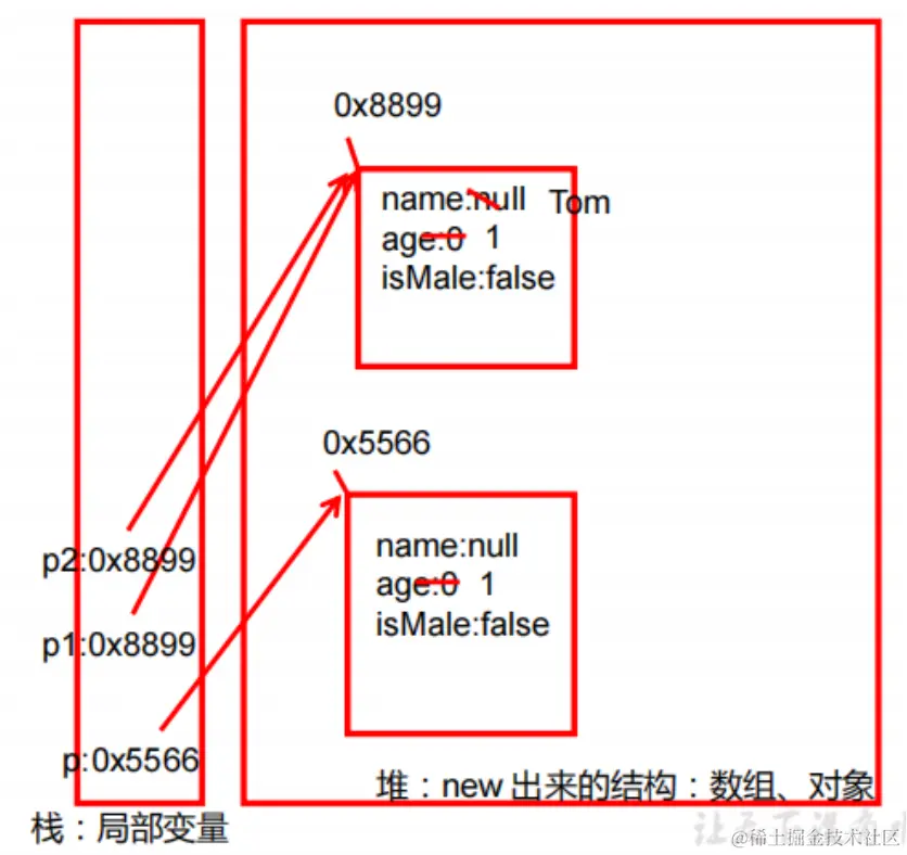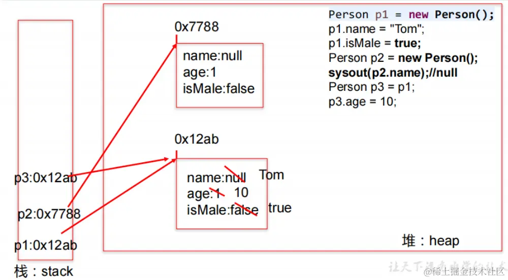 Person p1 = new Person();执行完后的内存状态。其中类定义如下: