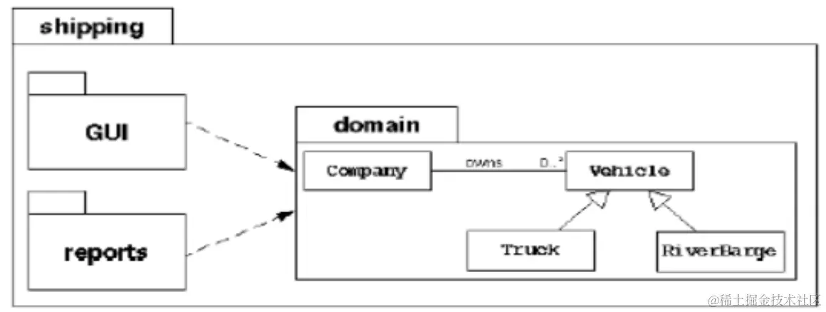 例:某航运软件系统包括:一组域对象、GUI和reports子系统