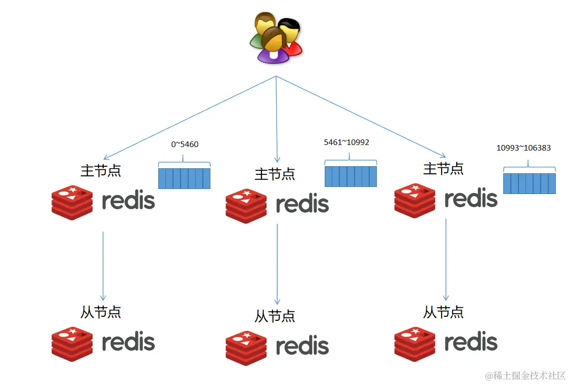 - 集群初始化时,会将 16384 个槽均匀分配给集群中的所有节点。