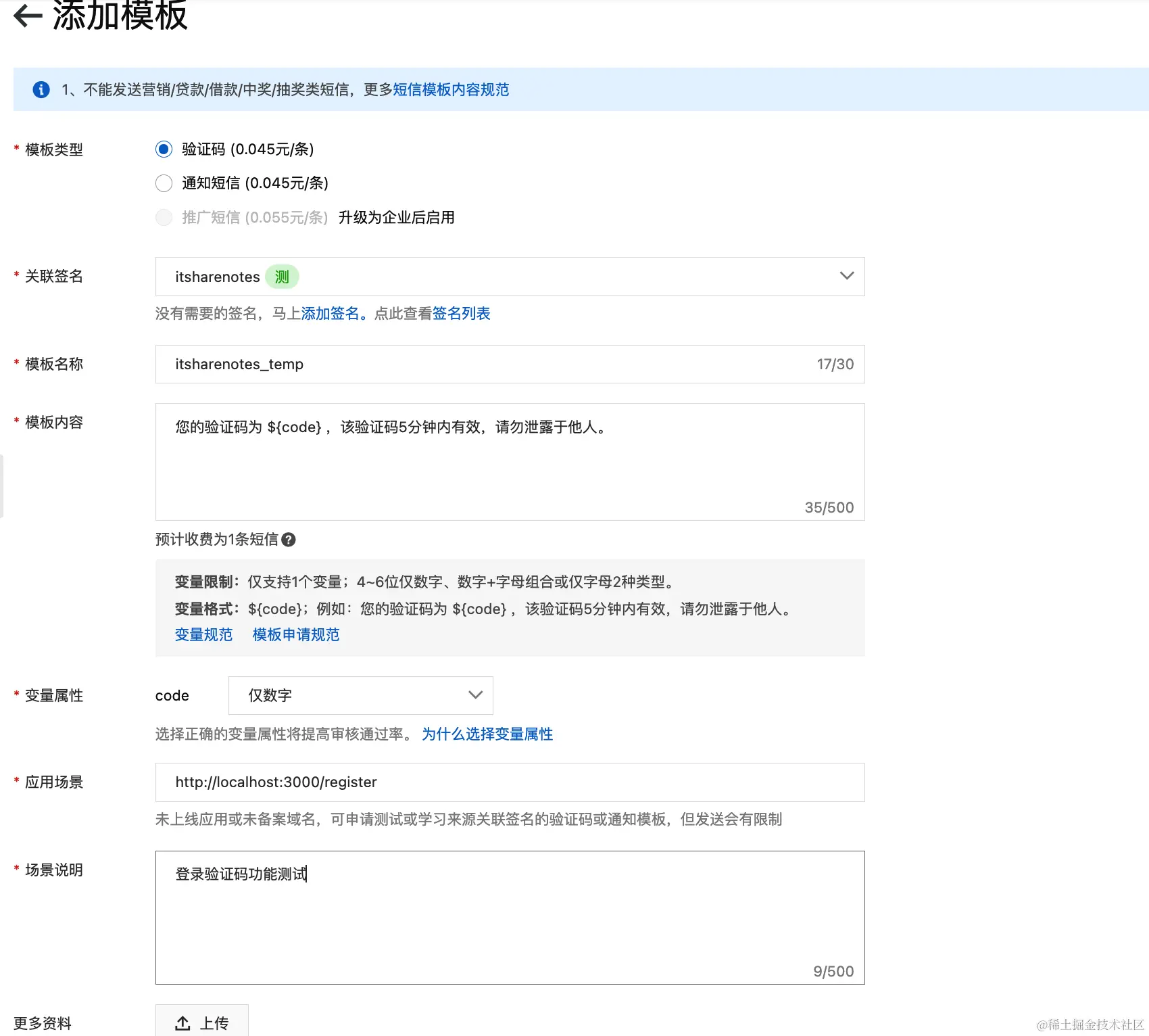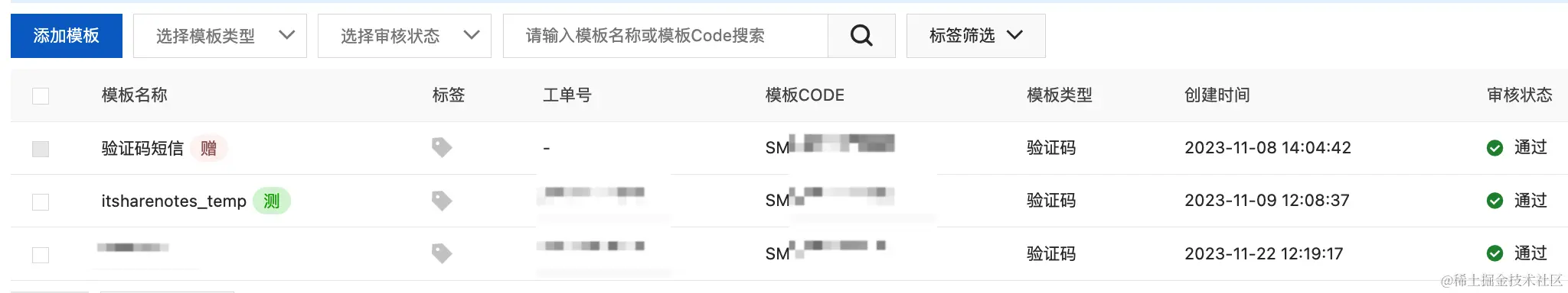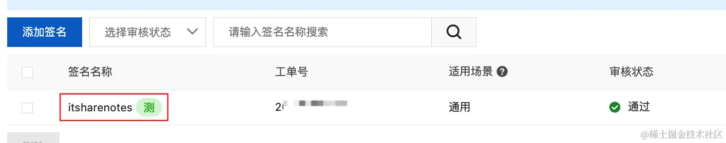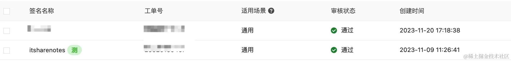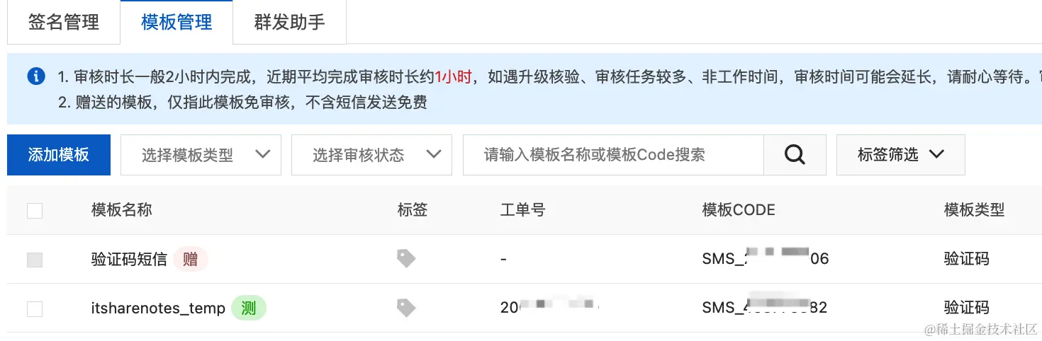 申请完成后需要保存两个数据,签名名称(SignName)和短信模板CODE(TemplateCode)