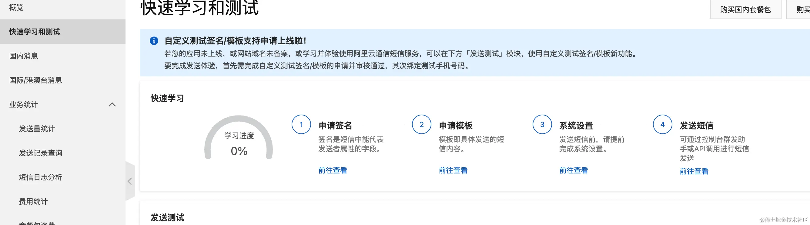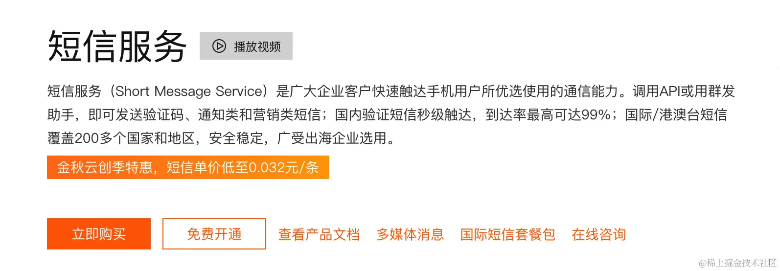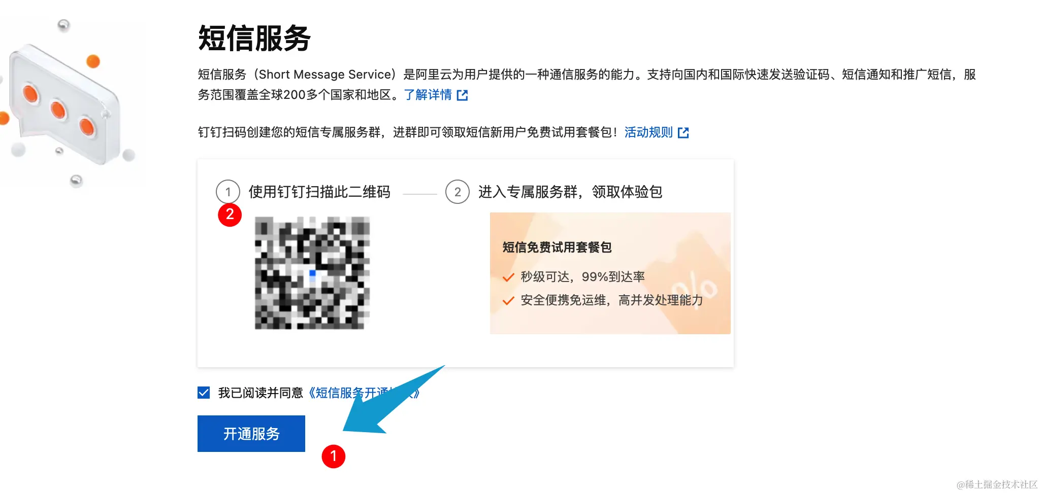 阿里云官网的产品导航搜索短信服务,然后点击免费开通