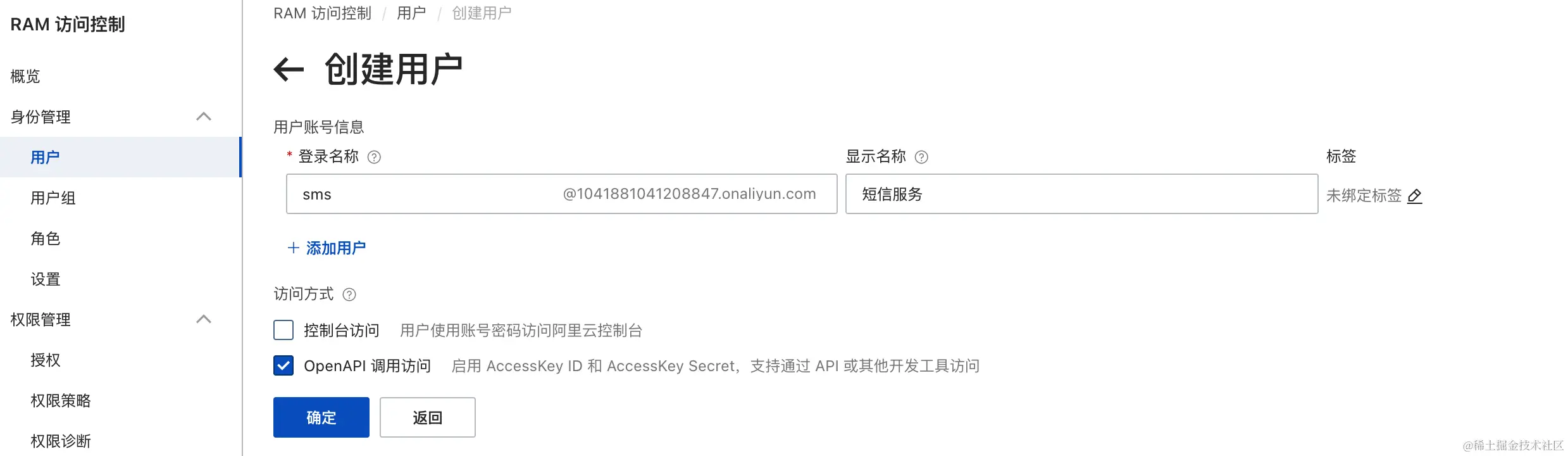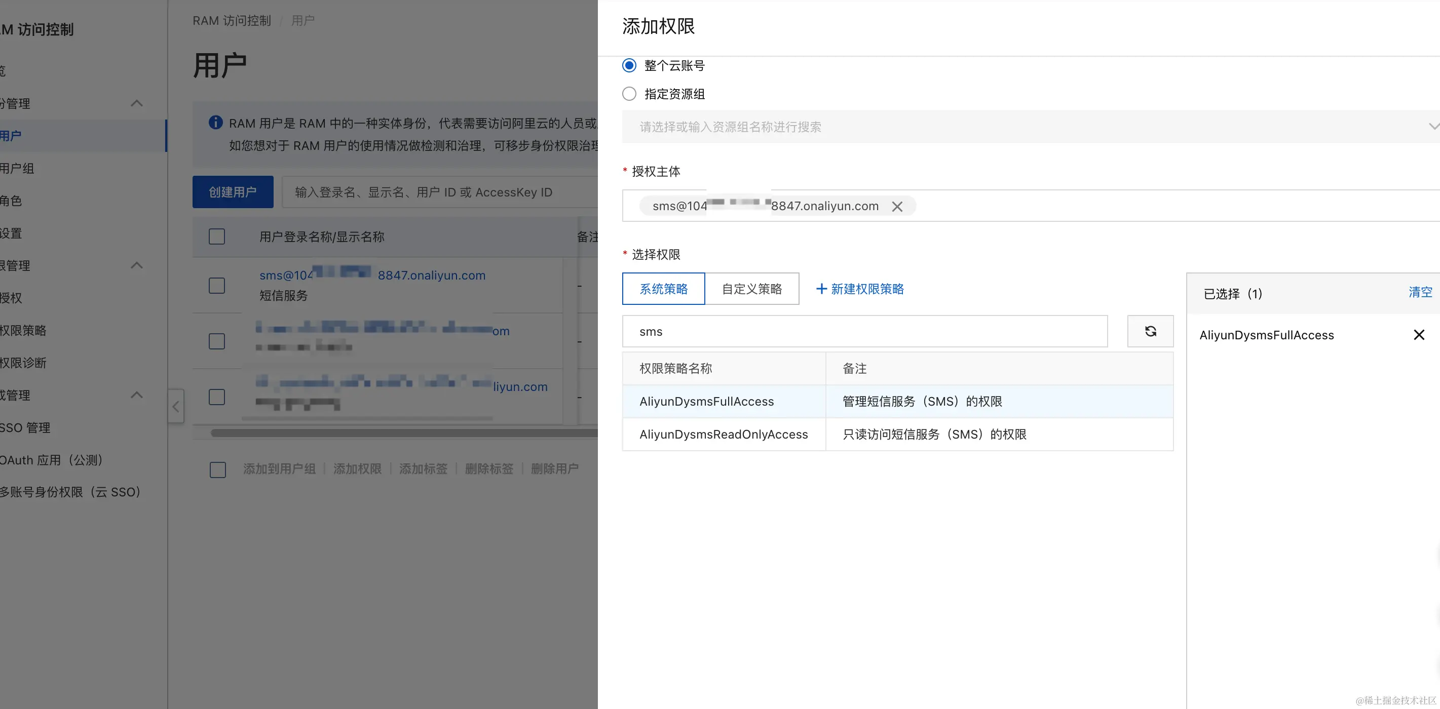 给该用户添加管理短信服务(SMS)的权限