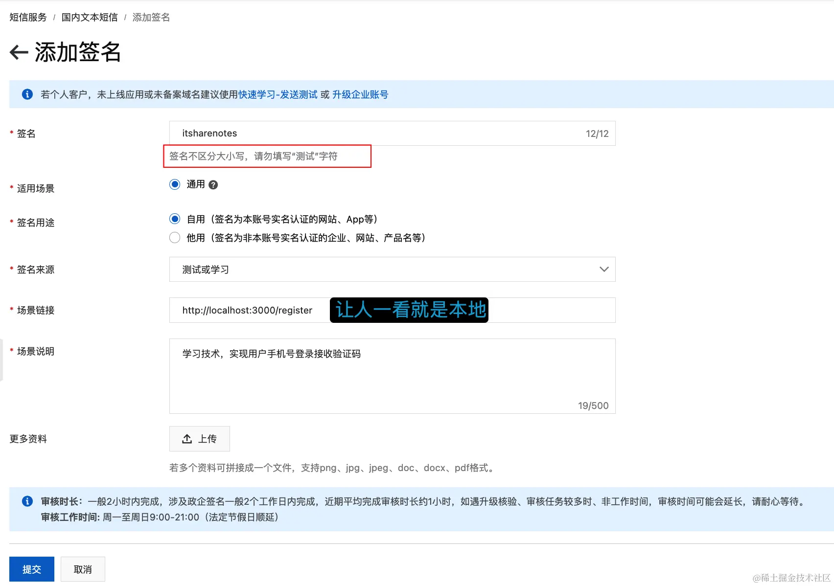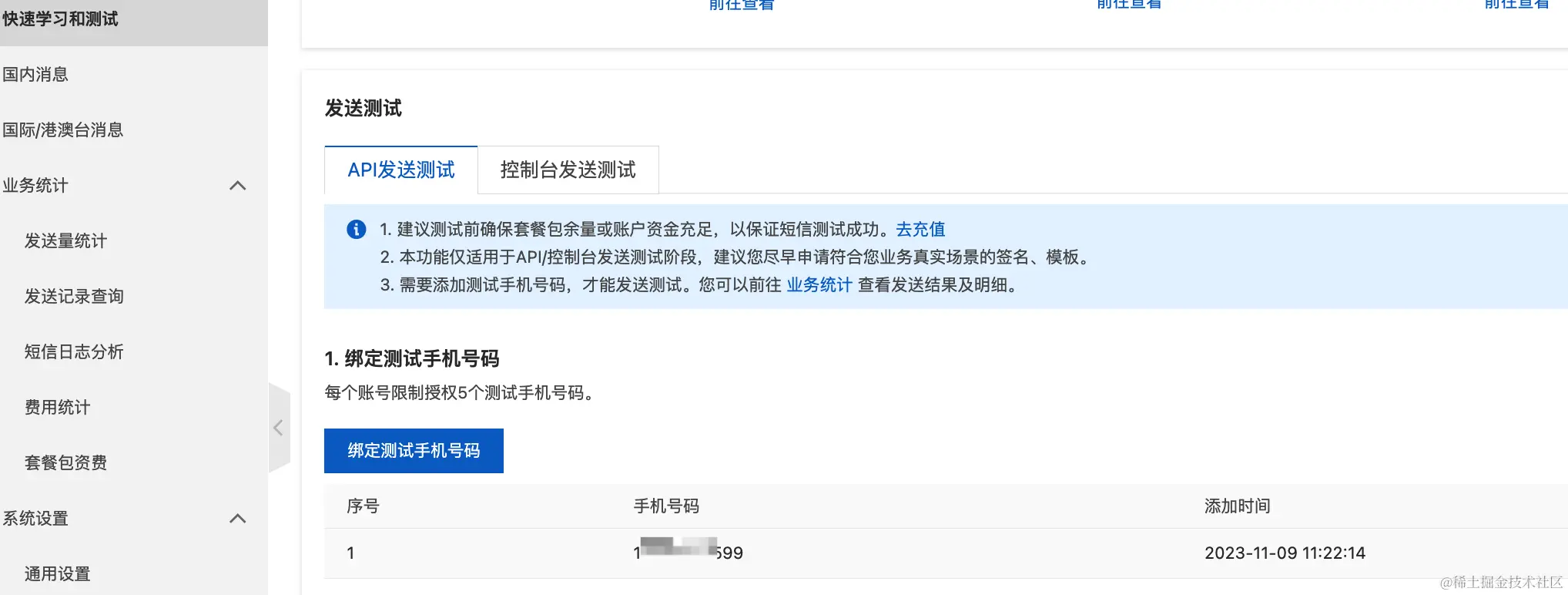 因为我们这里填写的是测试签名,所以需要绑定测试手机,通过该手机来接收短信,需要上线时选择已备案网站就可以使用国内手机号了