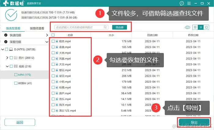 第3步:耐心等待扫描完成,可以根据不同的图片或视频类型对扫描结果进行查看和选择,在文件呈现较多的情况下,可以借助【筛选器】定位文件;