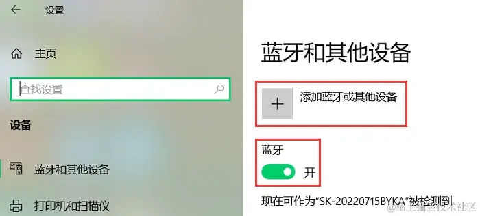 步骤2:在 【蓝牙】 下找到开关按钮,打开蓝牙。如果你需要添加设备,可以单击 【添加蓝牙或其他设备】 选项。
