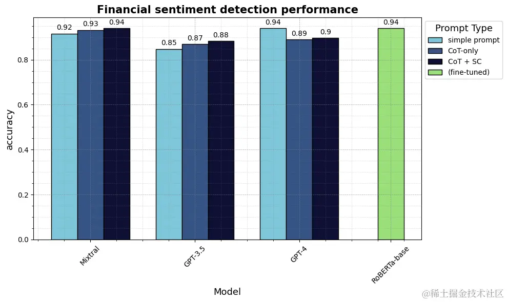 我们最终微调的约 0.13B 参数的 RoBERTa-base 模型与更大的 LLM 相比表现如何?下图显示,在 1811 个文本上微调的自定义模型达到了 94% 的准确率,与它的老师 Mixtral 和 GPT4 一样!一个小型模型当然无法与一个更大型的 LLM 出厂即战,但通过在一些高质量数据上进行微调,它可以达到在它所专长的任务上与大型 LLM 相同的性能水平。
