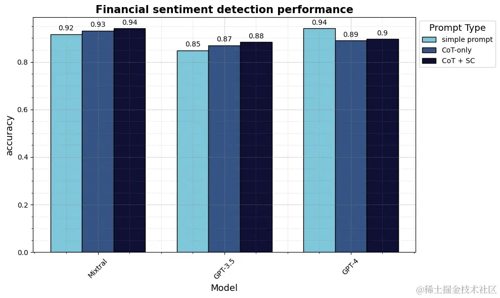 我们通过使用两个简单的提示 Prompt 技巧来进一步提升精度: 思维链 COT 和 自我一致 SC。CoT 要求模型首先对正确的标签进行推理,然后再做出标注决策,而不是立即决定正确的标签。SC 意味着多次向同一个 LLM 发送相同文本的相同提示。SC 有效地为 LLM 提供了针对每段文本的多条不同的推理路径,如果 LLM 回应“积极”两次和“中性”一次,我们选择多数 (“积极”) 作为正确的标签。这是我们为 CoT 和 SC 更新的提示:
