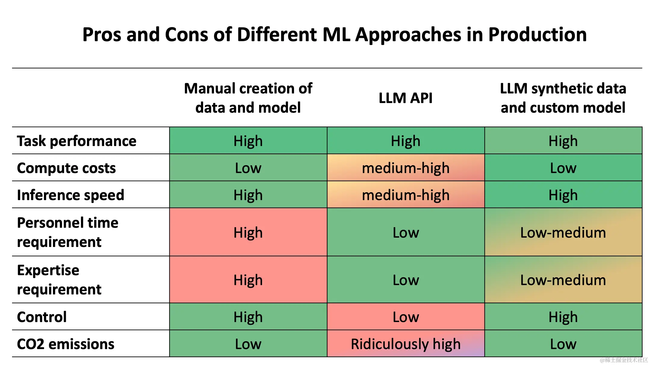 第三,在时间和专业知识方面的投资。这是 LLM API 的主要优势。与手动收集数据、微调定制模型和部署相比,向 API 发送指令要容易得多。这正是使用 LLM API 创建合成数据变得重要的地方。创建良好的训练数据变得显著更容易。然后,微调和部署可以由 AutoTrain 等服务和专业推理端点处理。