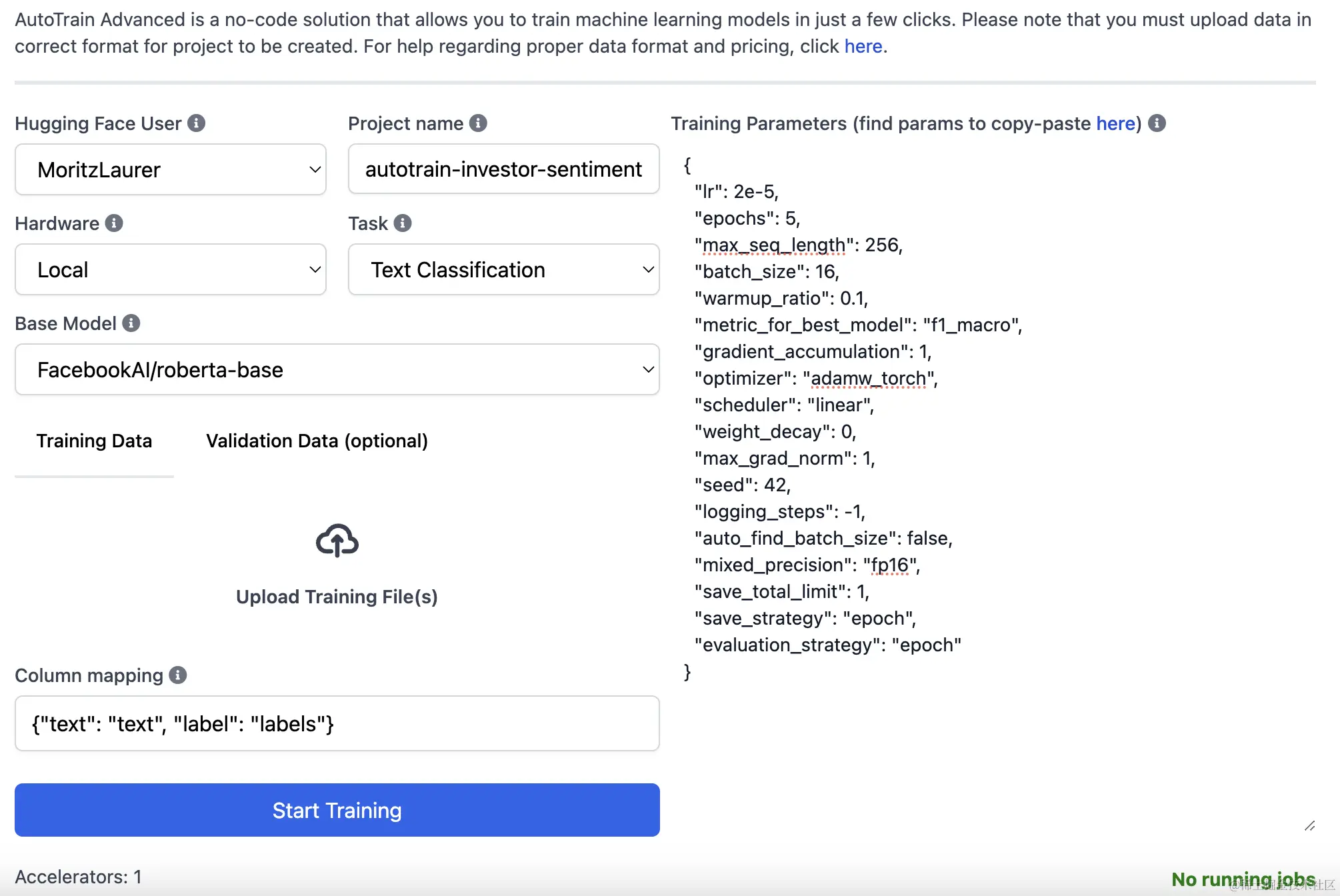 如果你愿意,你也可以完全在你自己的硬件上本地使用 AutoTrain,请参阅我们的 文档。高级用户当然总是可以编写自己的训练脚本,但对于这些默认的超参数,AutoTrain 的结果对于许多分类任务来说应该足够了。