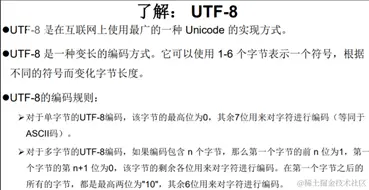 - UTF-8编码,即可变长的Unicode编码,UTF-8编码把一个Unicode字符根据不同的数字大小编码成1-6个字节,常用的英文字母被编码成1个字节,汉字通常是3个字节,只有很生僻的字符才会被编码成4-6个字节.如果你要传输的文本包含大量英文字符,用UTF-8编码能节省空间.