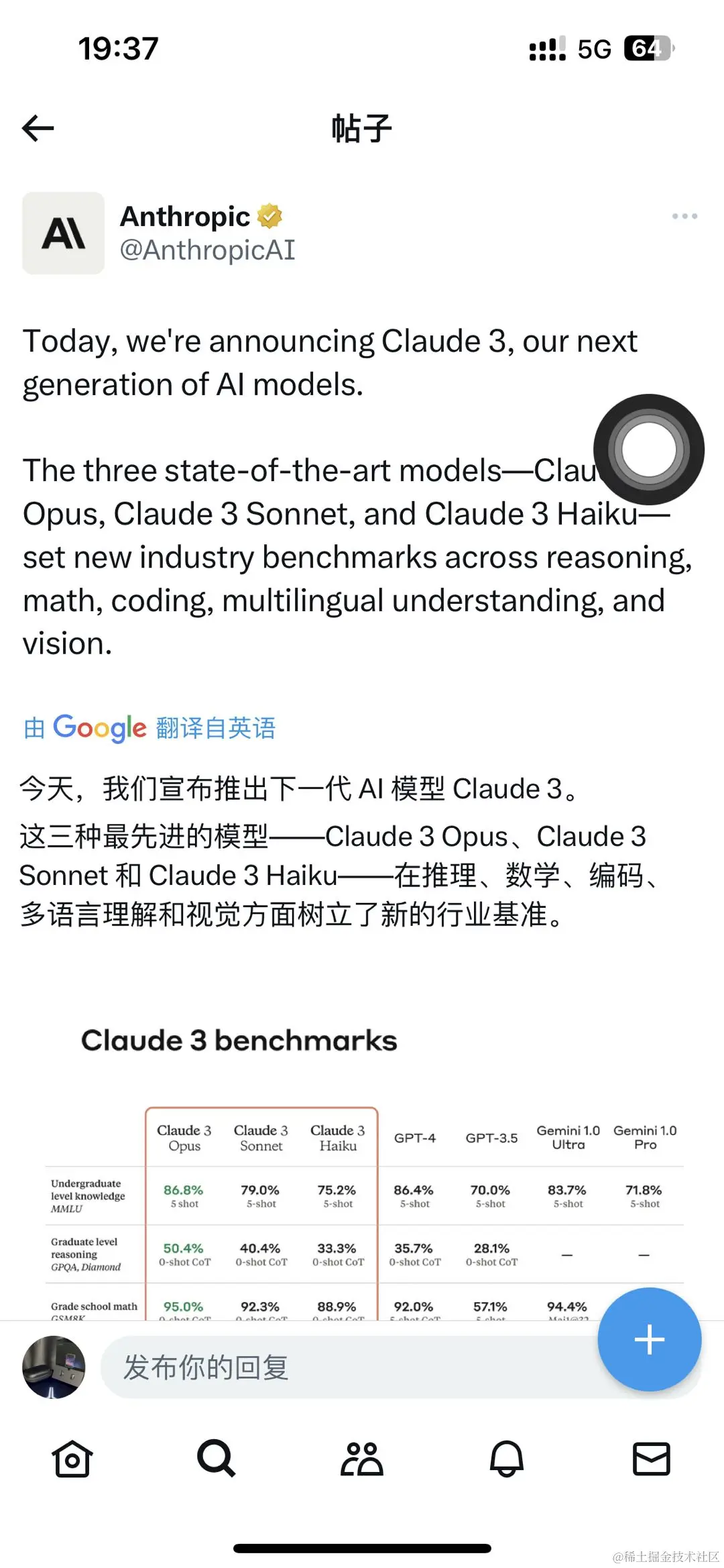 就在3月5号凌晨,大家还在睡梦中的时候,Anthropic在X上低调的发布了Claude3,没有华丽的辞藻,没有大篇幅的介绍,只是简单的发了个帖子......