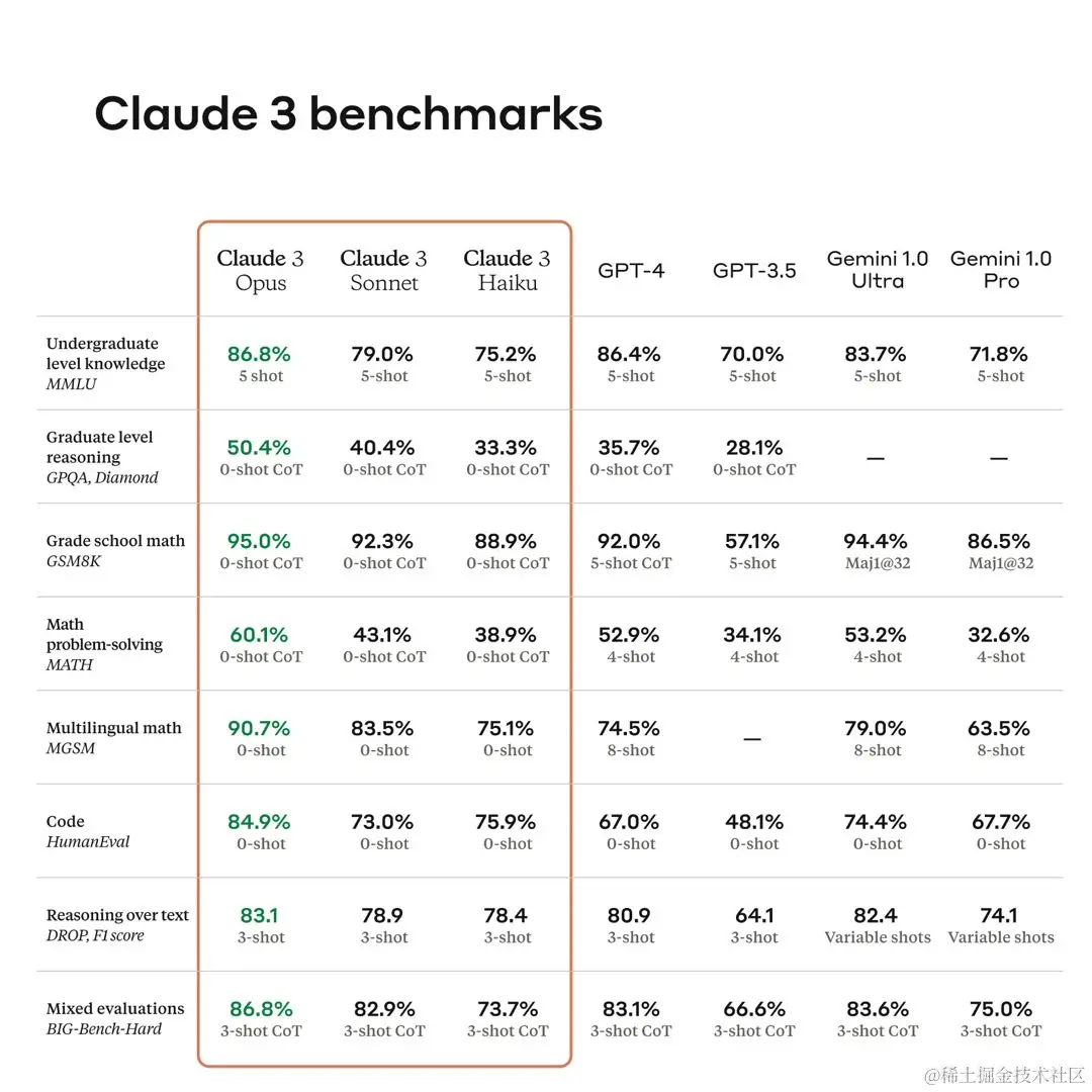 在Anthropic自己公布的测试数据中我们可以看到Claude 3 Opus基本上属于是全面超越GPT-4了,并且还是在几个任务0-shot【意思为没有给提示词的情况下直接要求机器人完成任务】的情况下,可以说这波Anthropic直接给GPT-4干趴下了