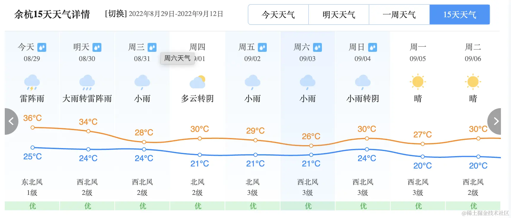 举例来说,比如某天气网站截图的余杭 15 天的天气预报: