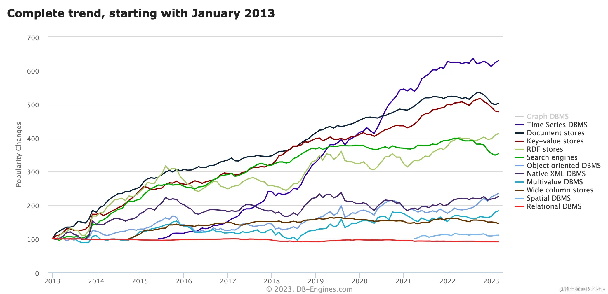 尽管时序数据并不是一种新的数据类型,但在过去的几年里,它的流行程度和使用量显著增加,正如 DB-Engines 所分析的那样。有几个因素不容忽视,包括: