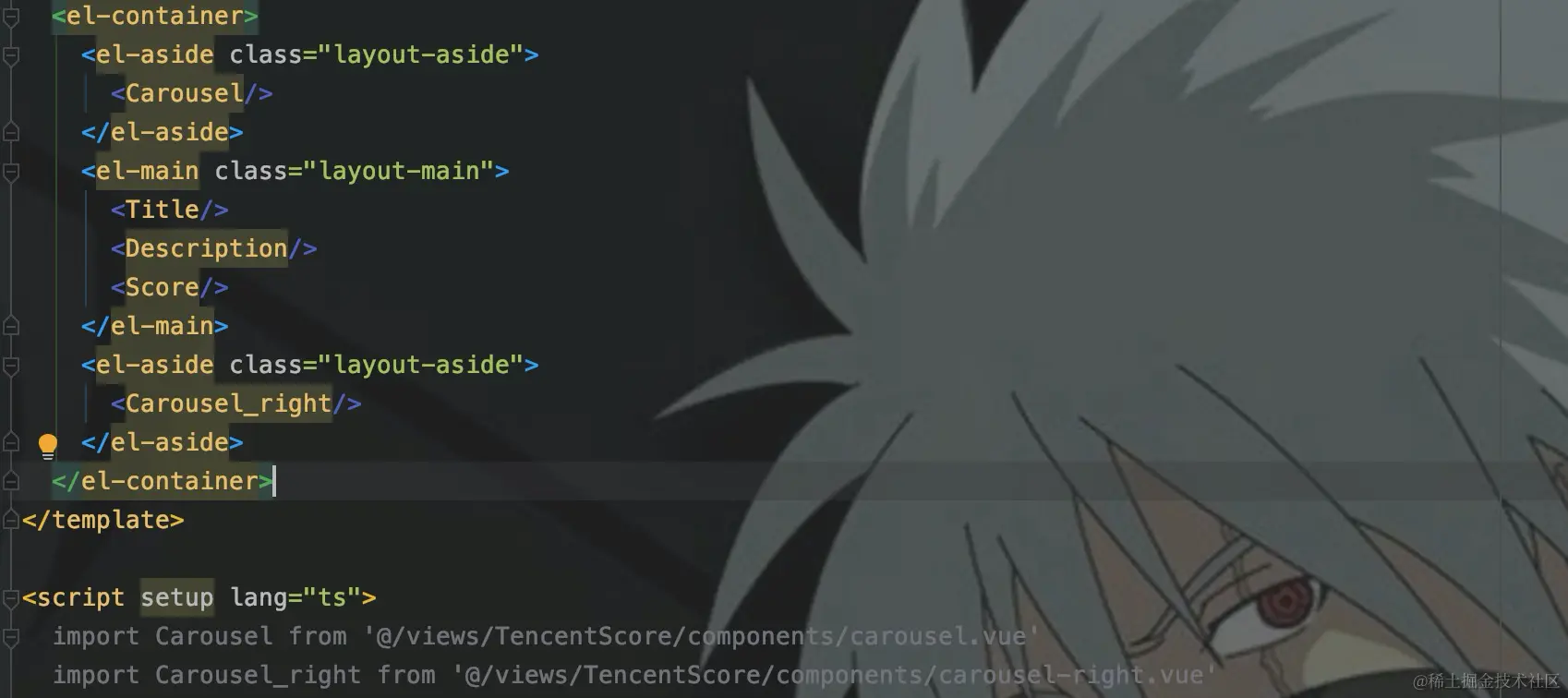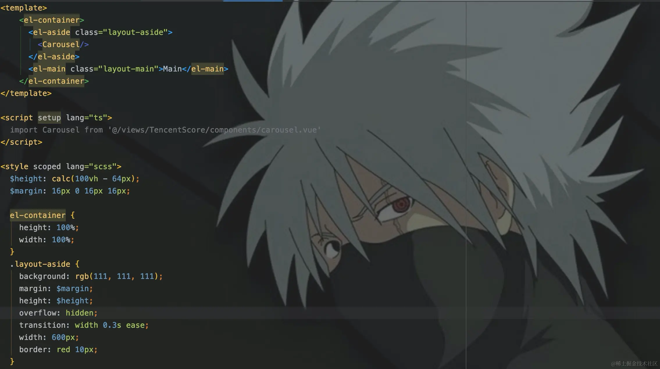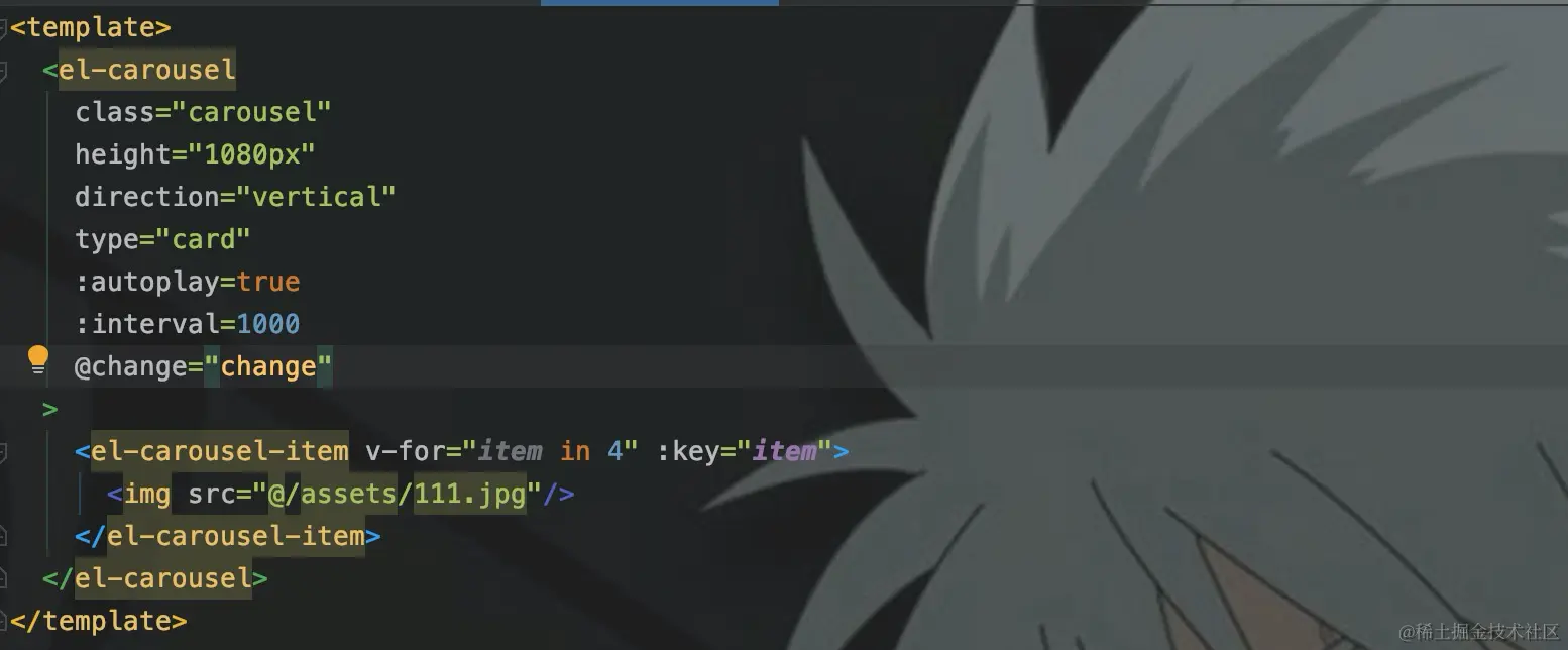 轮播图使用的是ElementPlus的el-carousel走马灯组件。动漫的封面是长图,像素是770 * 1080,这里进行50%的等比例缩放,来设置轮播框的宽高。