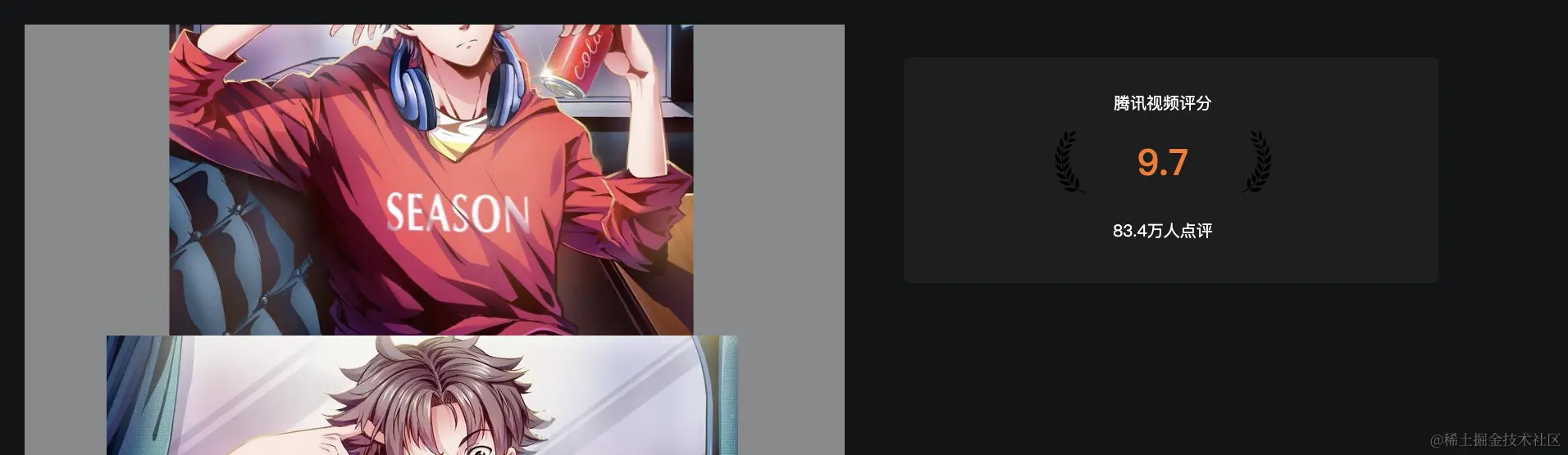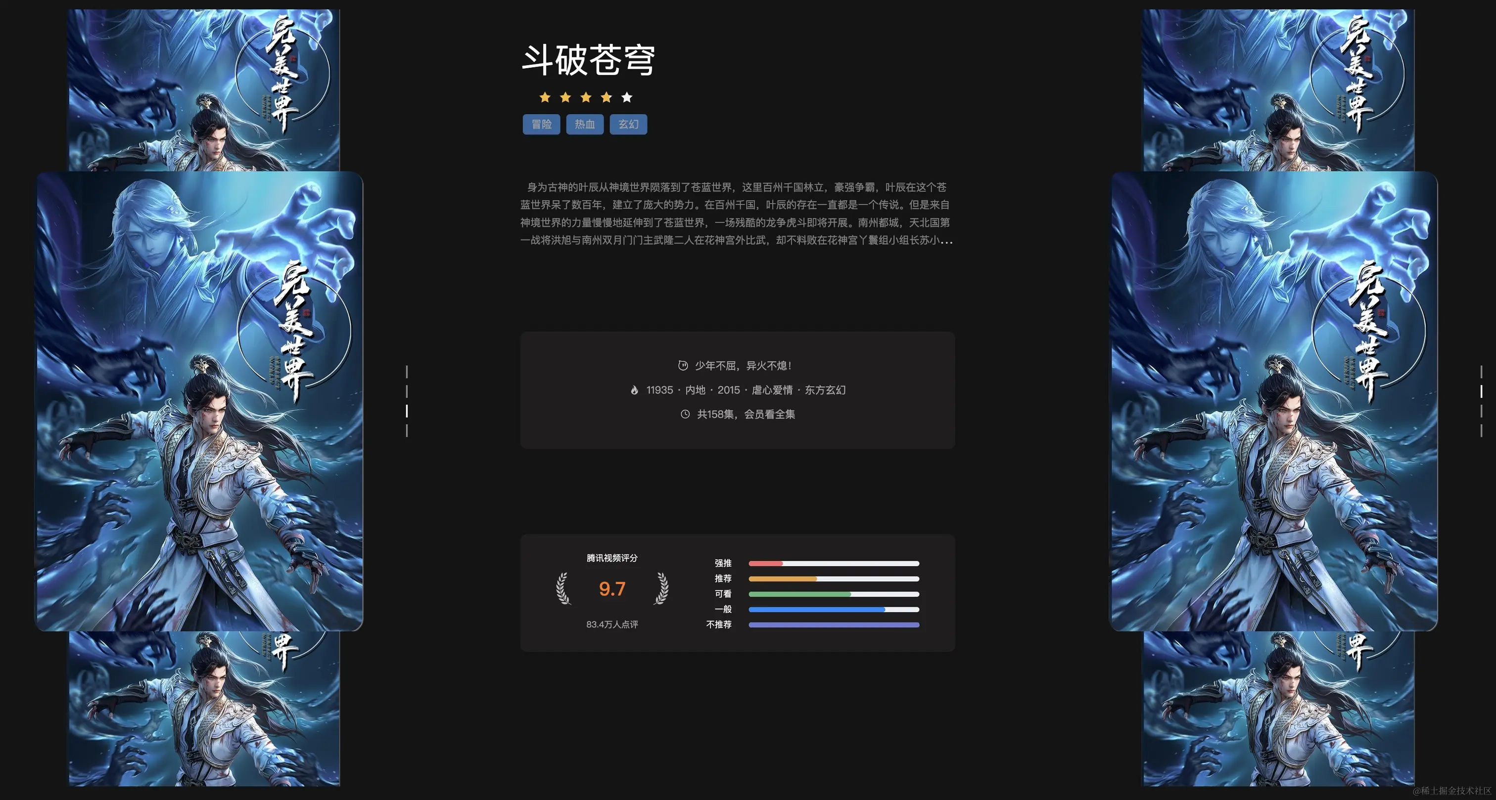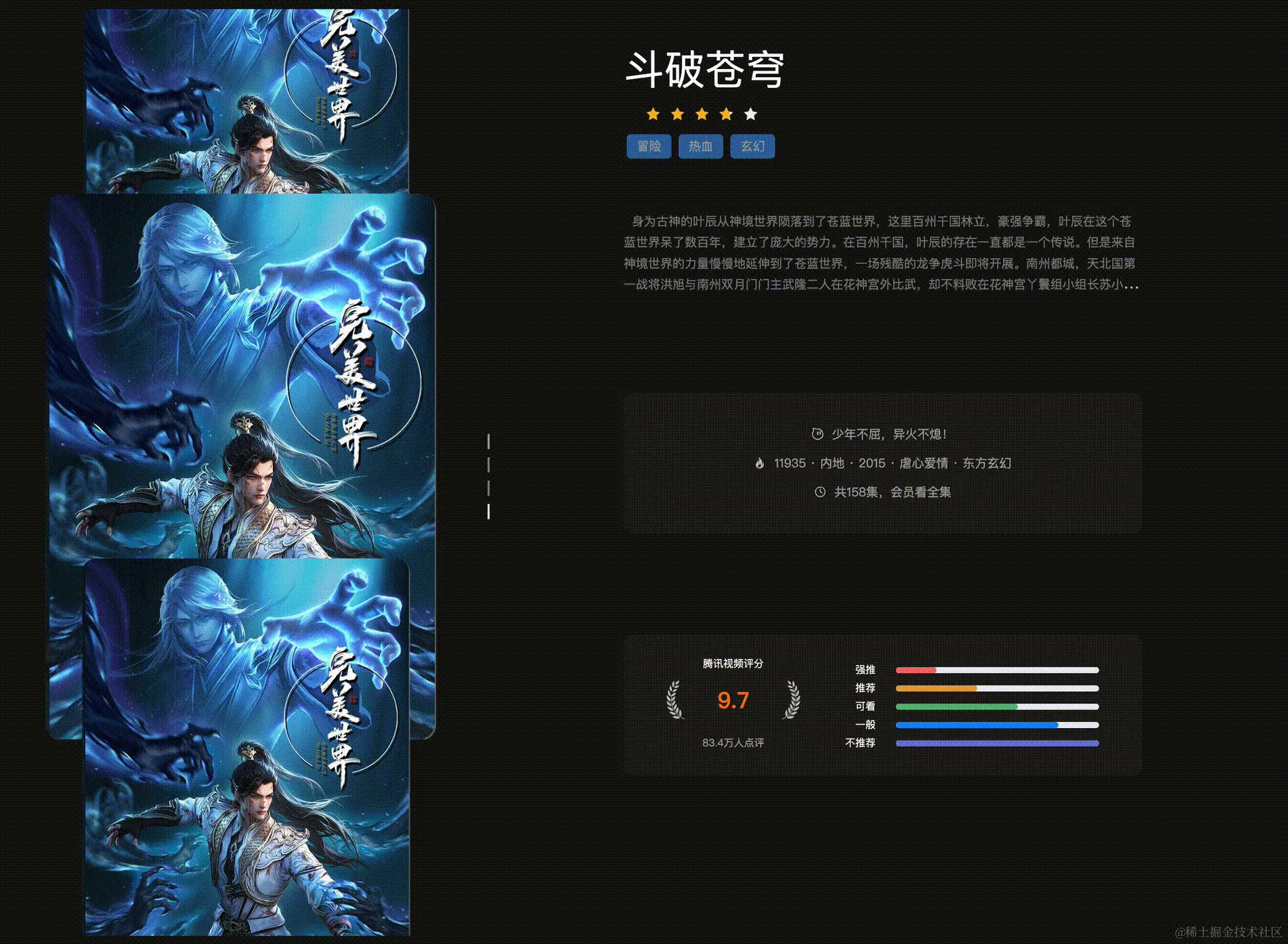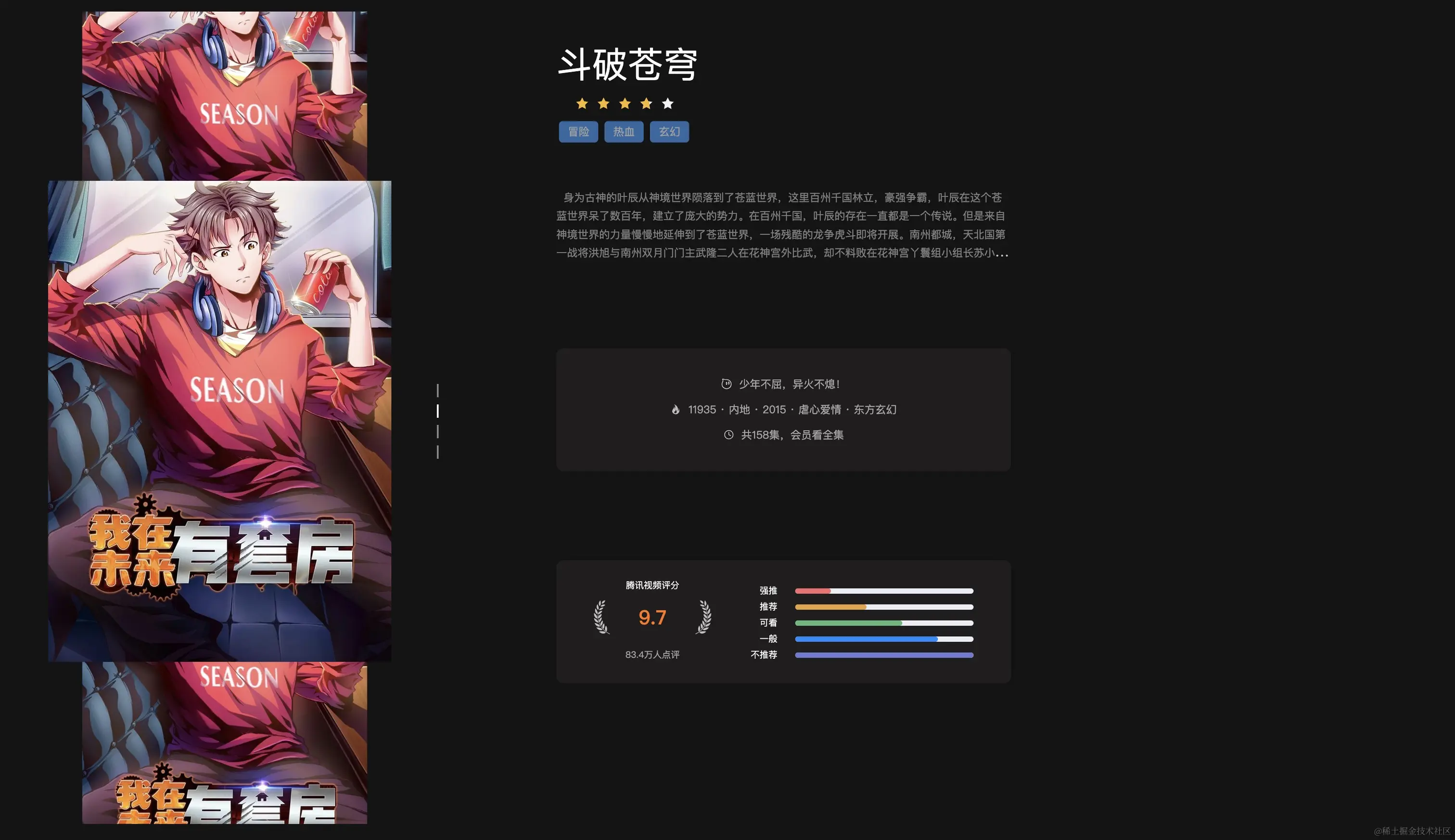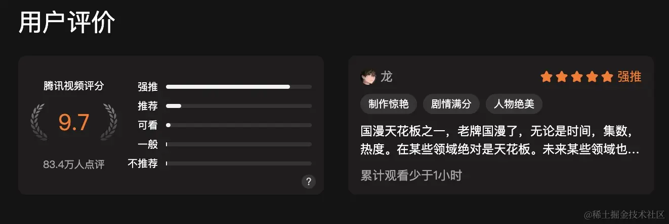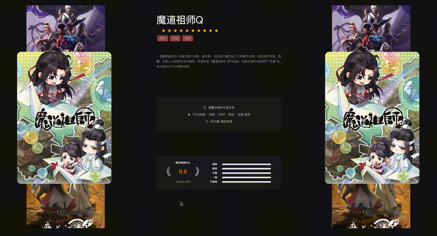 于是就打开腾讯视频看看评分,每个视频都要点开才能看到评分和介绍。随即就萌生了用技术整合国漫评分内容的想法。最后历经一周,完成了一个简单的评分展示系统。