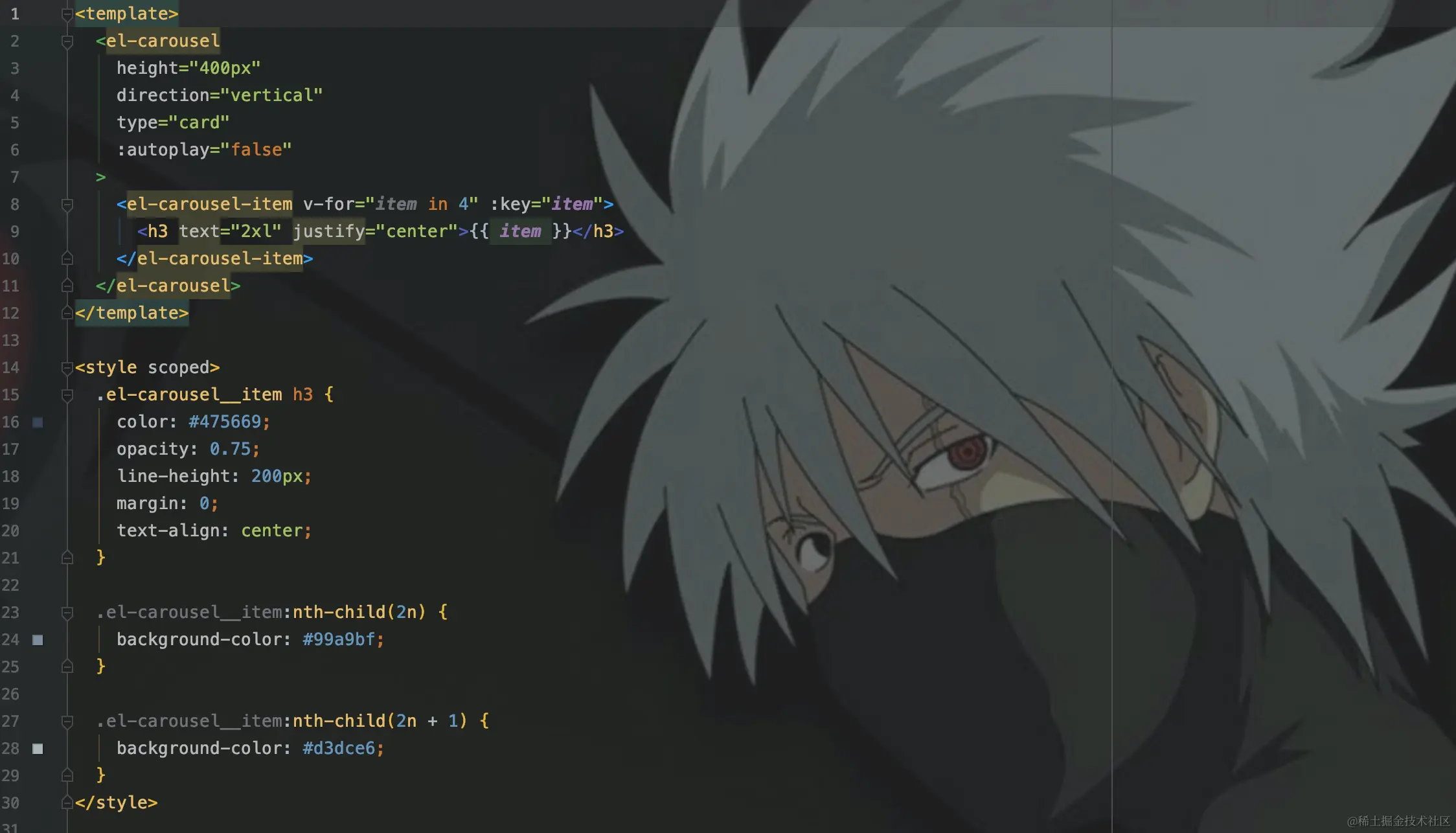 主要是对img和el-carousel__item组件做了一些细节、定位的设计。这里提一下el-carousel__mask,必须要要加important来强制改变为透明颜色,这样才能和背景色颜色一样。