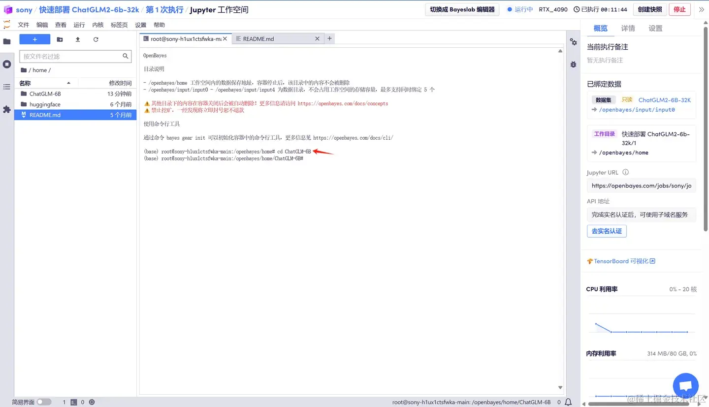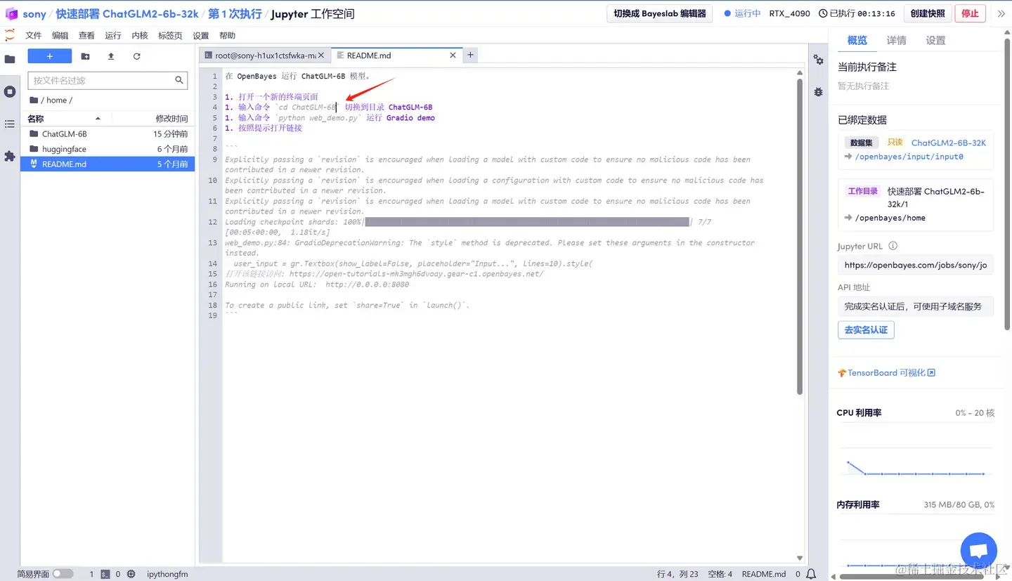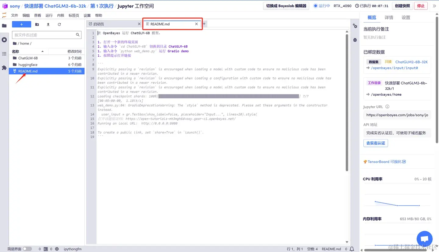 进入工作空间的界面后,首先打开左侧的 「README.md」,按照页面中显示的流程进行操作。
