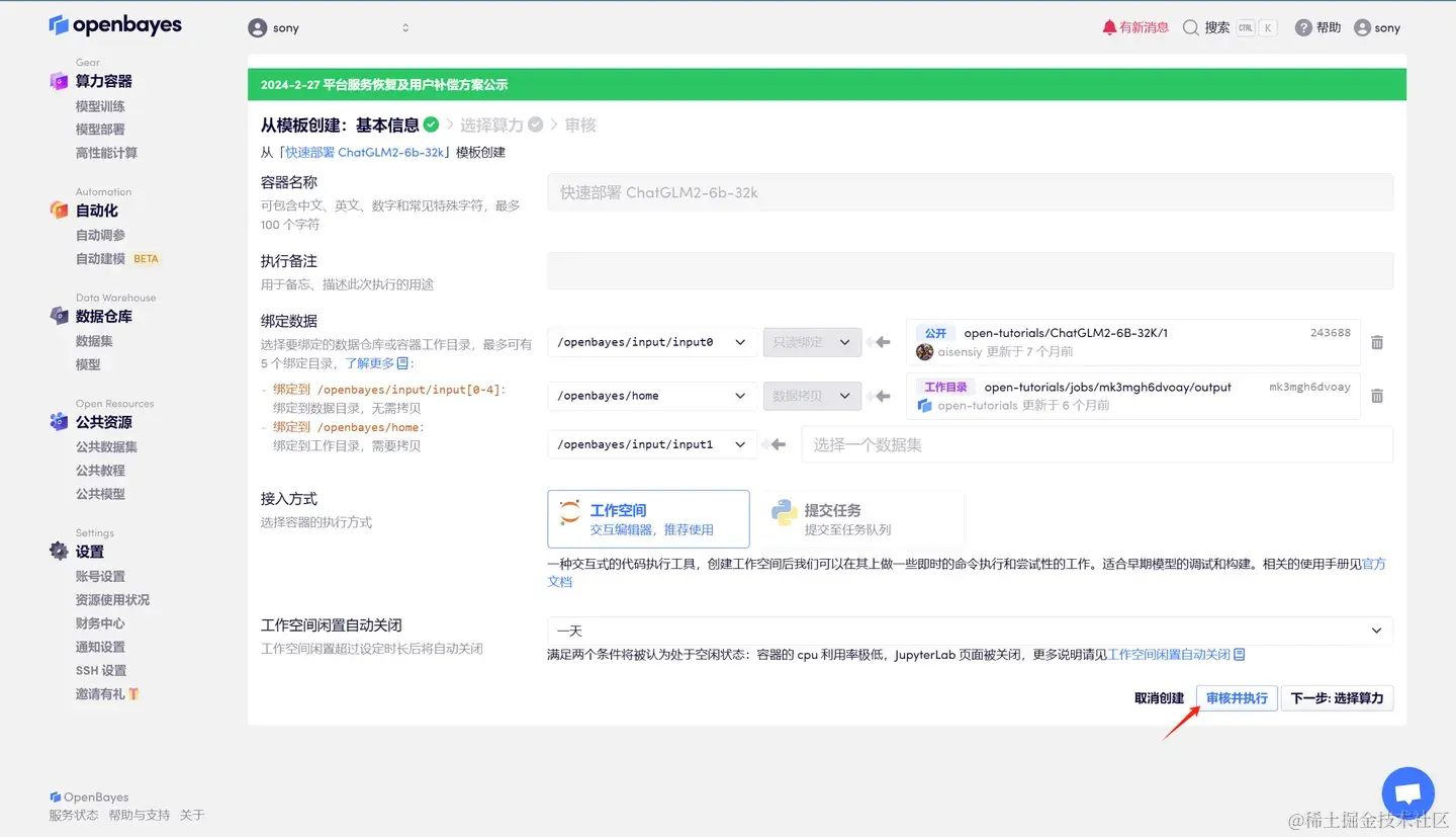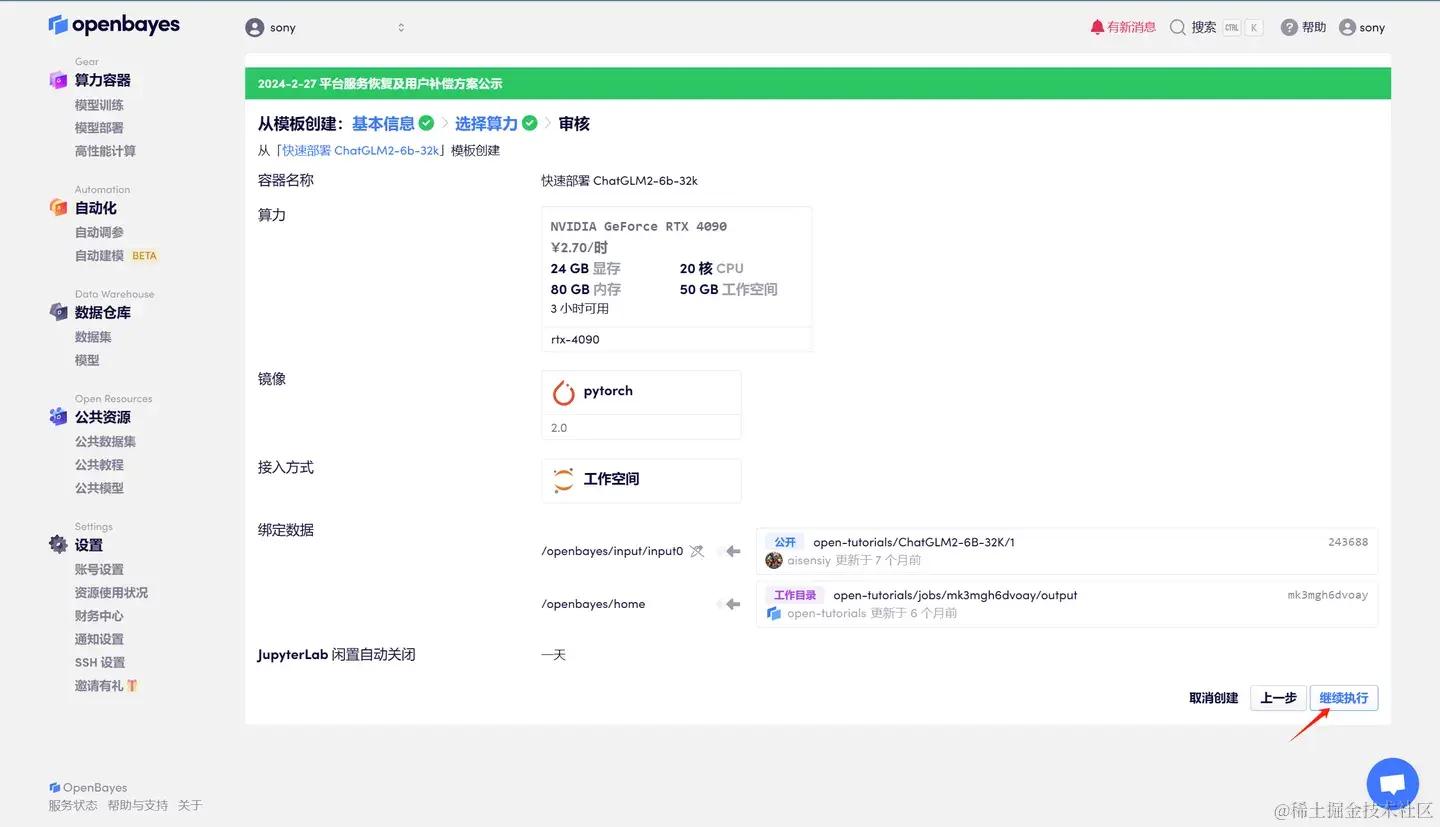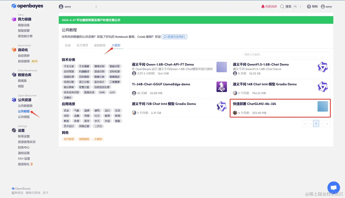 首先点击「公共教程」-「大模型」,选择「快速部署 ChatGLM2-6b-32k」