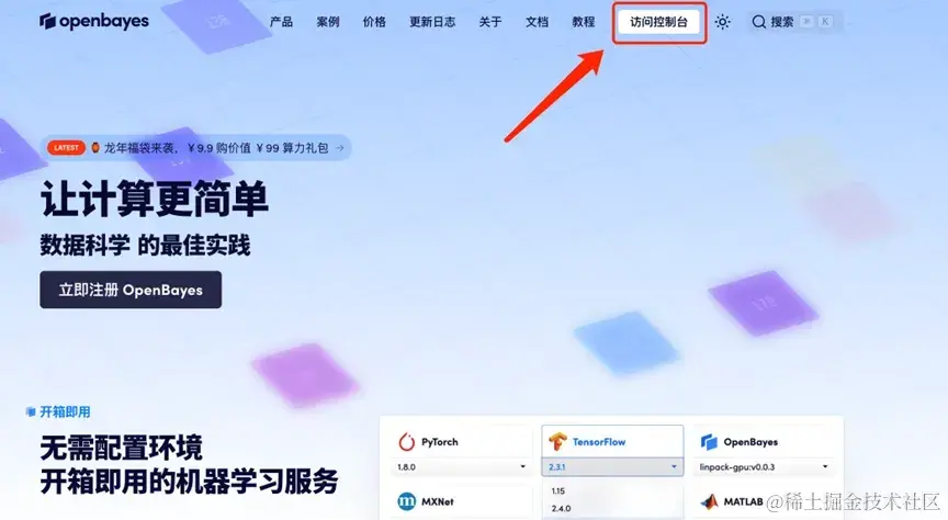 首先,登录 OpenBayes.com ,点击「访问控制台」。