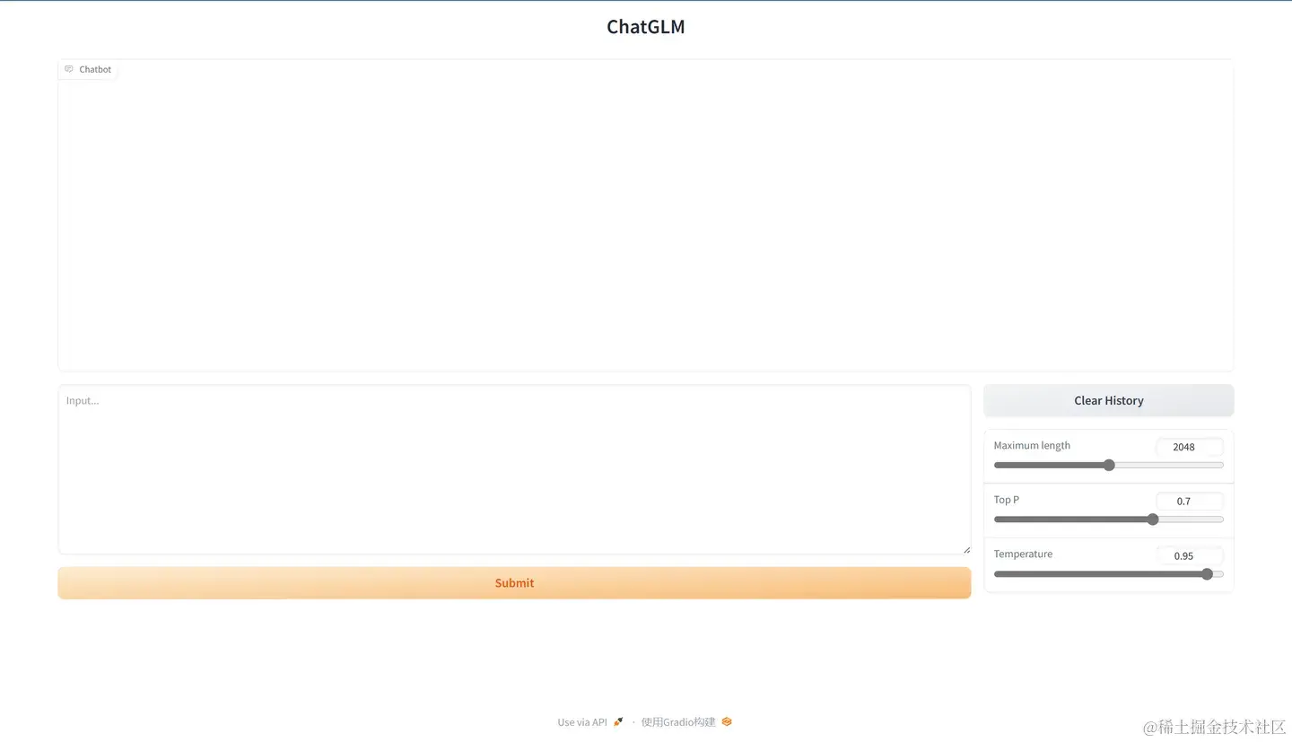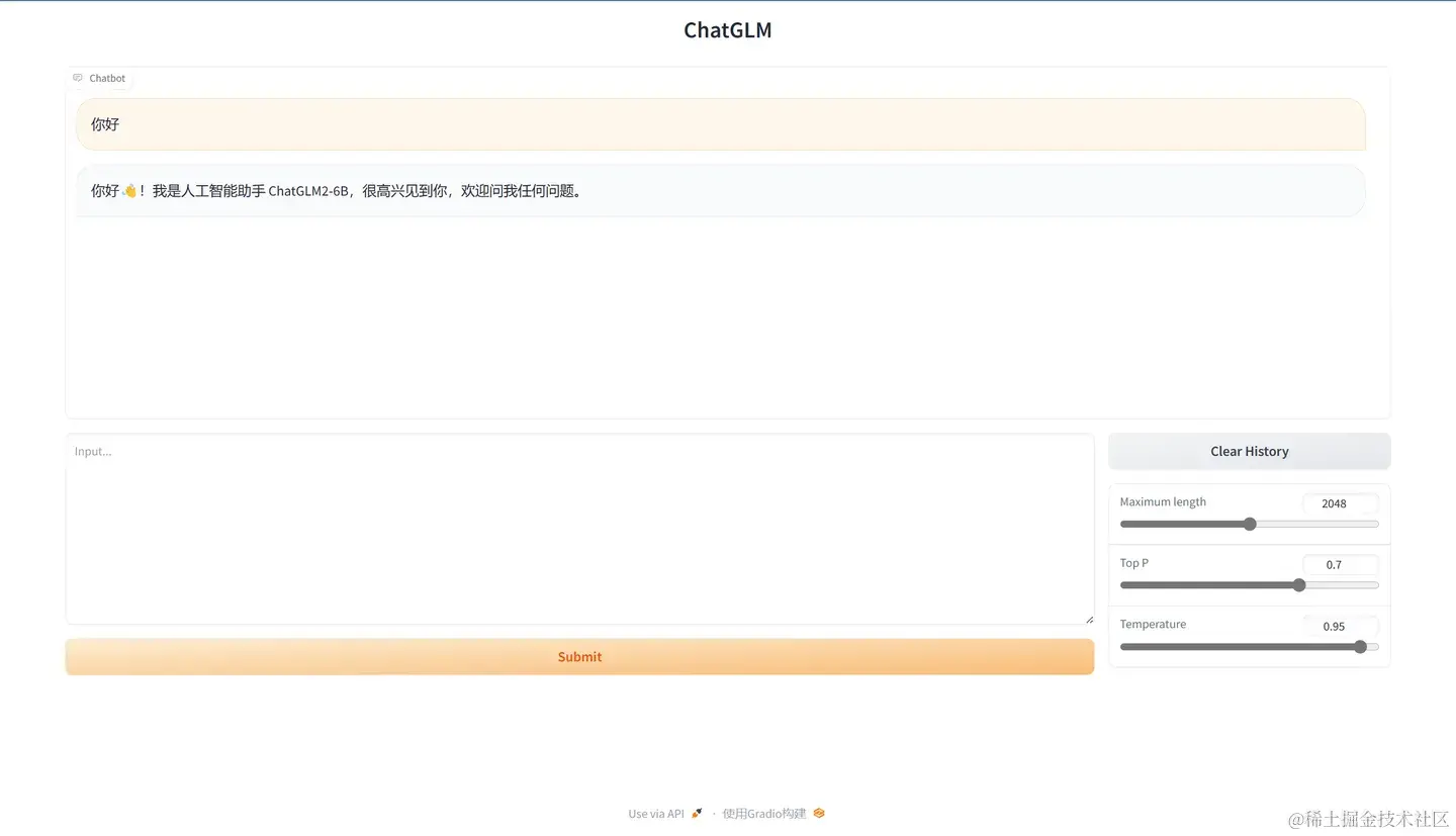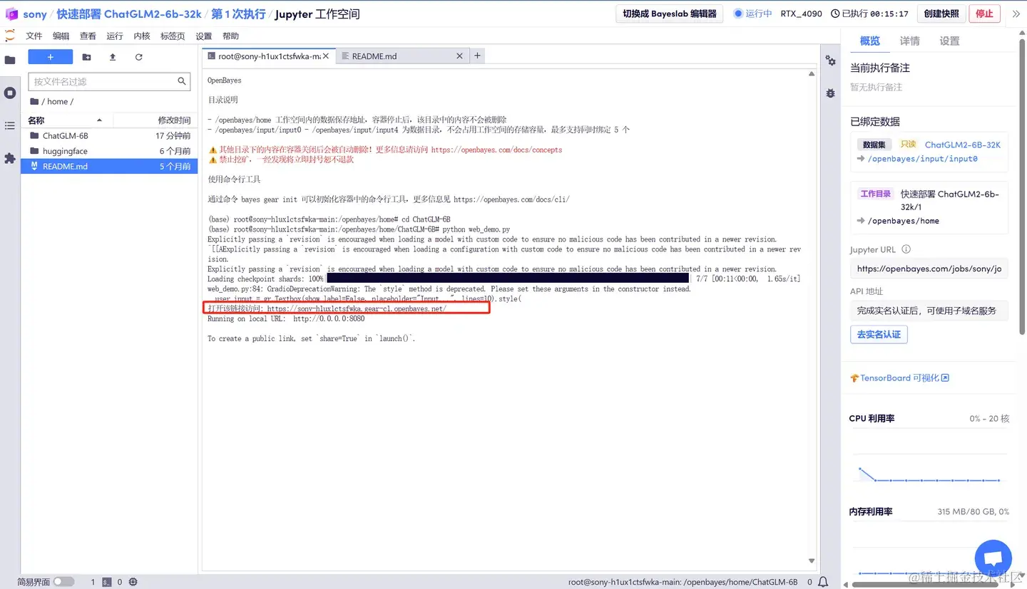 稍等片刻,待新的访问链接出现后,在一个新的标签页打开它,就可以看到一个 ChatGLM 的 Gradio。