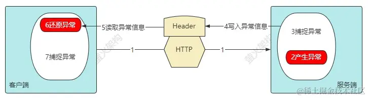 以Restful为例,当服务端产生异常时,我们通过拦截器或者程序内部的中间件捕捉到这个异常,提取出其中的异常信息,并中断这个异常的继续抛出,然后把拿到的异常信息写到HTTP Header中,返回到客户端。客户端的HTTP请求程序则从HTTP响应的Header中读取到这些异常信息,然后再把他们包装成异常(Exception),throw 出来。最后客户端中的业务代码就可以使用 try-catch 捕捉到这个异常,并根据错误码进行相应的处理。