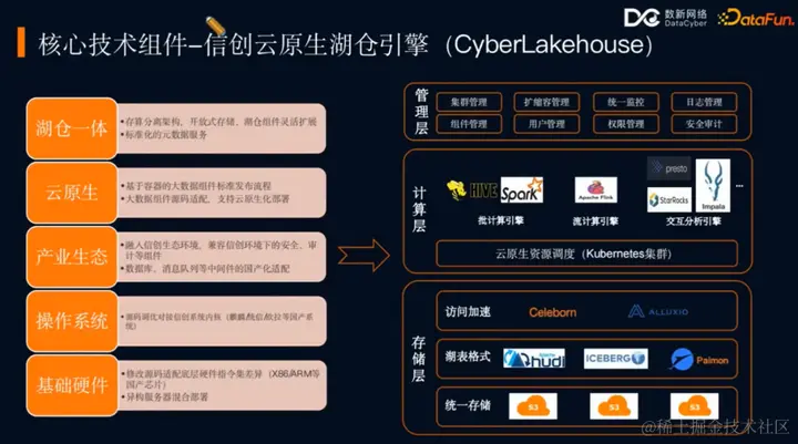 首先是信创云原生湖仓引擎(CyberLakehouse),这是一个结合了信创环境和云原生技术的湖仓引擎。它在信创环境中进行了全栈适配,从基础硬件到操作系统,再到产业生态,确保大数据组件的国产化适配。在此基础上,实现了基于容器化的大数据组件标准化发布流程和源码适配,支持云原生部署。再往上是湖仓一体架构,它要求存算分离、开放式存储、计算组件灵活扩展,以及统一标准化元数据服务。