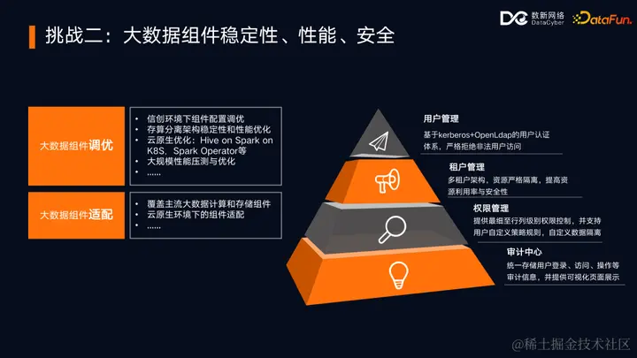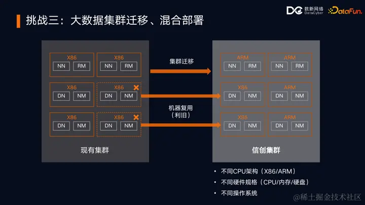 第三个挑战是大数据集群的迁移和混合部署。这个过程是逐步推进的,涉及新老集群的并行运行和过渡。因此,需要开发支持异构环境下集群数据迁移的工具,并最大化复用现有老集群的服务器资源。