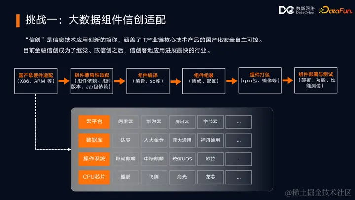 “信创”是我国信息技术应用创新的简称,其目标是推动 IT 产业链核心技术的国产化,实现安全自主可控。大数据组件的信创化适配是信创战略的重要组成部分。在金融行业,信创化的推广和落地正在加速进行,大数据组件信创适配是当下的重要挑战。