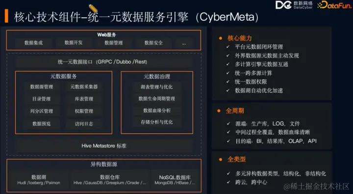 统一元数据服务引擎 CyberMeta 是大数据平台的核心技术组件,它实现了湖仓平台元数据在整个平台的统一管理,以及外部数据源元数据的主动发现和多计算引擎间元数据的互通互联。此外,它还支持跨多元计算场景,以及在元数据基础上的统一数据权限管理和数据湖的自动化优化加速。