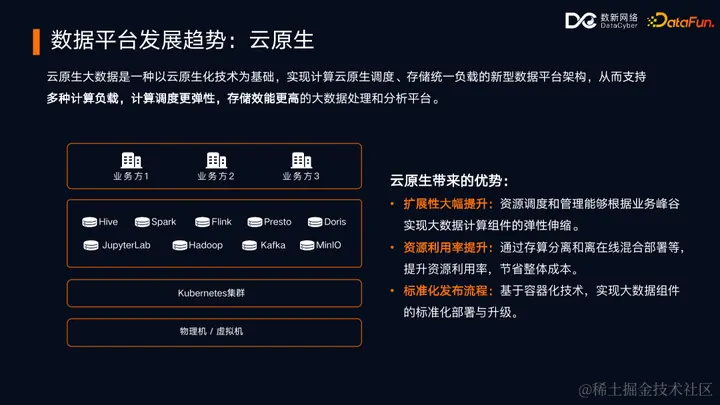 进入云原生时代后,存算分离的架构变得更加多元化。底层存储可以是 HDFS,也可以是 S3 对象存储等,而资源调度框架则全面拥抱 Kubernetes 进行资源调度和管理。这种架构提供了更高的灵活性和扩展性,有助于优化资源使用和降低成本,同时保持大数据平台的高性能和可靠性。