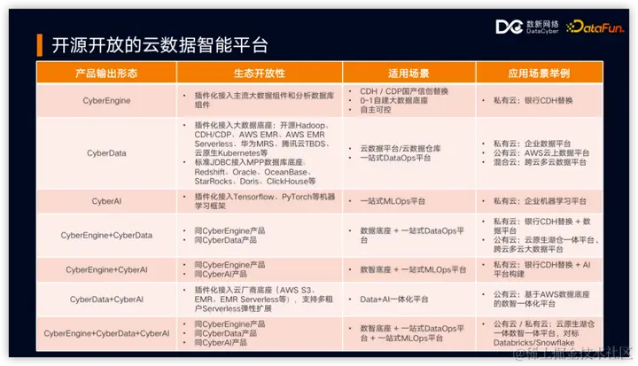 云数据智能平台 DataCyber 展示了其产品的高度开源开放性。DataCyber 的三个主要产品 CyberEngine、CyberData 和 CyberAI 均能单独输出,并与其他开源组件和大数据分析数据库保持最大兼容性。这些产品通过插件化和标准化方式,支持包括 CDH/CDP 国产化替代、大数据底座构建、数据开发和治理以及机器学习框架集成等多样化场景。