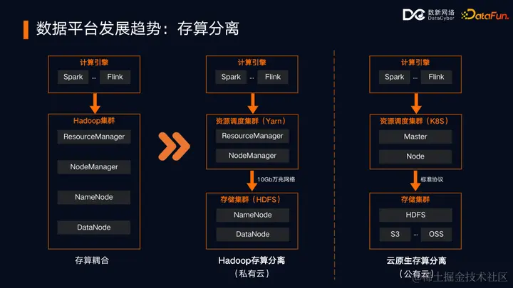 第三个重要趋势是存算分离。长期以来,Hadoop 一直以存算一体的架构提供大数据能力,但随着企业内部网络带宽的快速增长和数据规模的膨胀,以及数据湖技术的发展,大数据基础设施正朝着存算分离的架构演进。