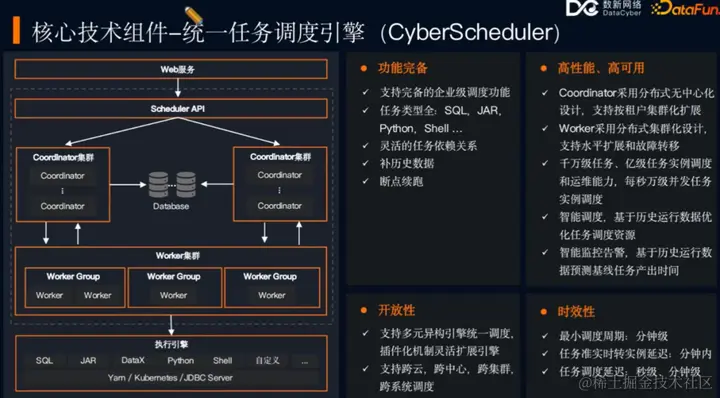 统一任务调度引擎 CyberScheduler 是大数据平台的另一个核心技术组件,它负责数仓任务的工作流调度,确保了任务的高效执行和数据流程的稳定性。CyberScheduler 的架构分为三层:
