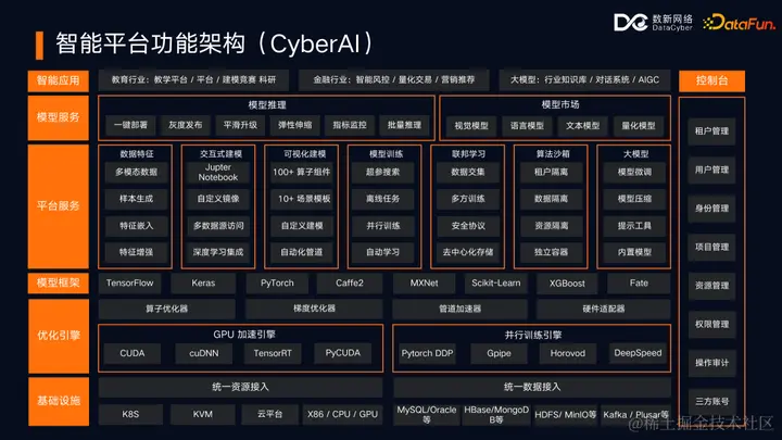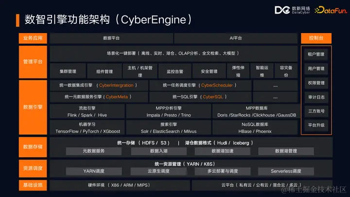 - CyberEngine:负责提供湖仓引擎底座以及大数据集群管理运维能力,为数据平台和 AI 平台提供底座支撑。
