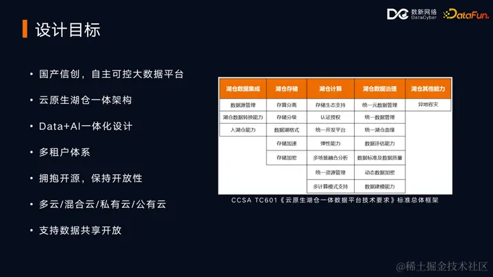 在介绍 DataCyber 技术架构之前,首先阐明一下整个系统的设计目标。平台的首要设计目标是在国产信创环境下,打造一个技术上自主可控的大数据平台。同时,我们并不追求从零开始研发大数据引擎,而是希望通过开源社区生态,共同参与构建新的大数据引擎技术,确保平台的开放性和兼容性。